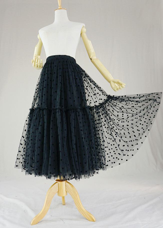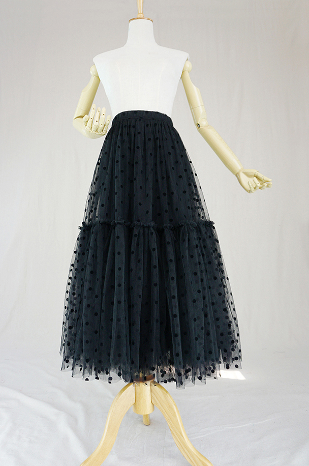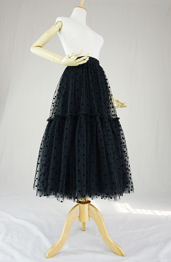 Black High Waisted Midi Tulle Skirt Lady Black Dot Tulle Midi Skirt Black Tulle Party Skirt