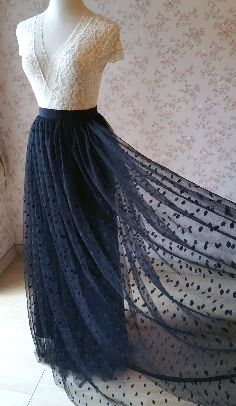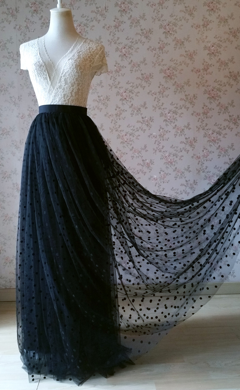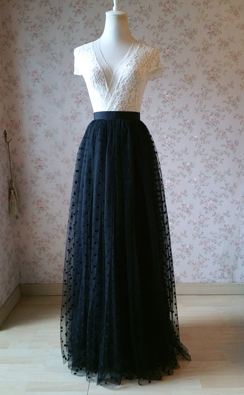 Women Black Maxi Tulle Skirt Black Polka Dot Tulle Skirt Black Party Skirt High Waist Plus Size
