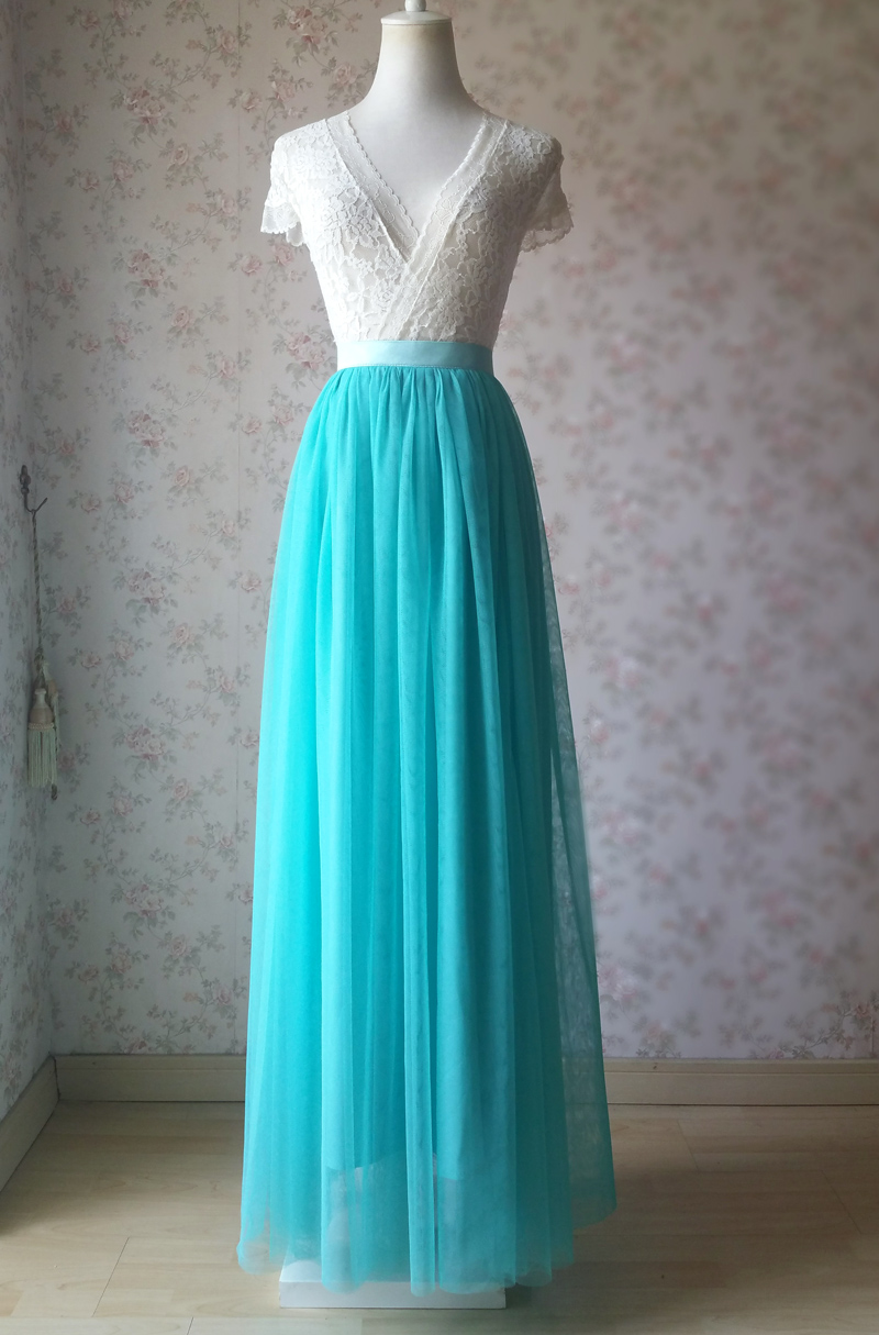 Aqua Blue Adult Long Tulle Skirt Fixed High Waisted Aqua Blue Wedding Tulle Skirt Bridesmaid Group Maxi Tulle Skirts Plus Size