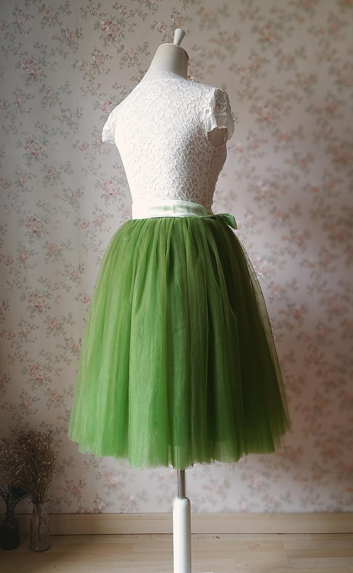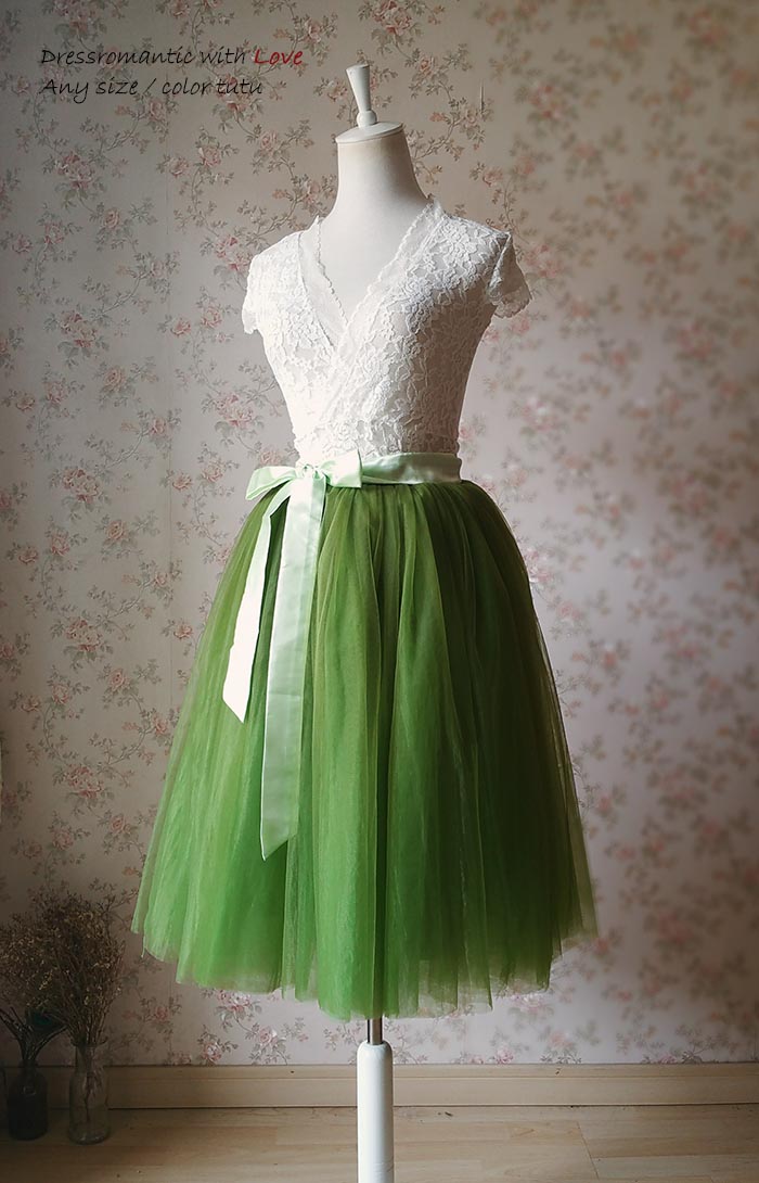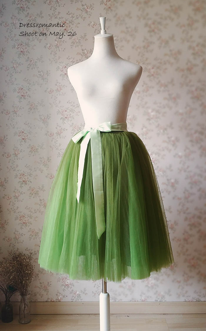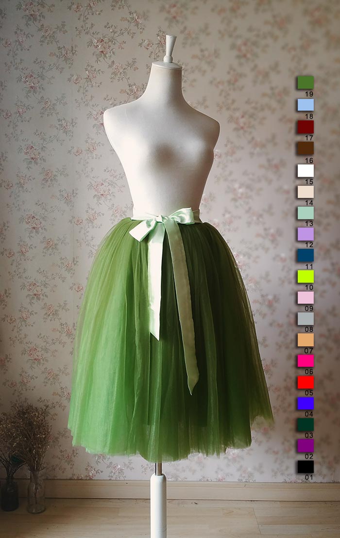 Women Olive Green Aline Tulle Midi Skirt Party Skirt Wedding Bridesmaid Tulle Skirt