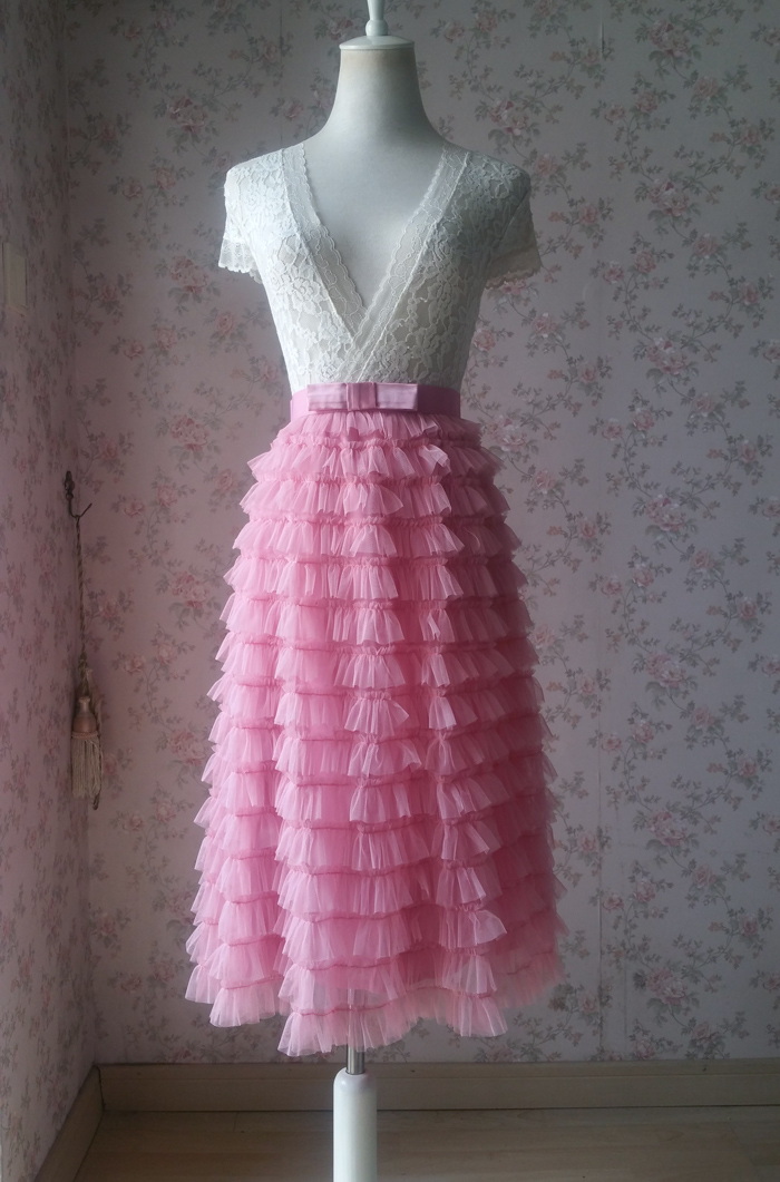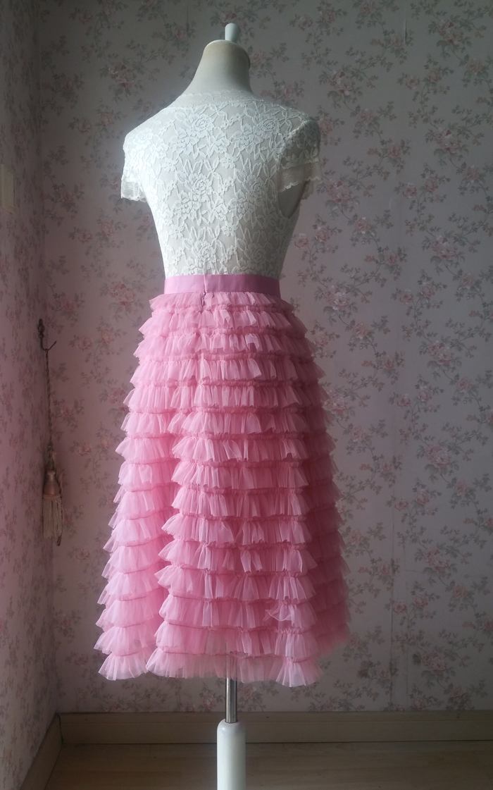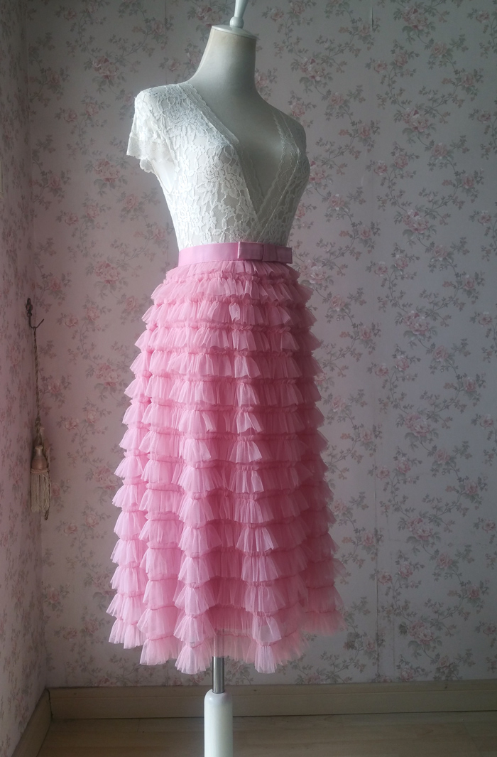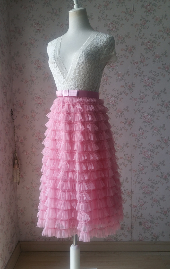 Women Tiered Midi Tulle Skirt Women High Waisted Tulle Midi Princess Skirt, Pink, Plus Size