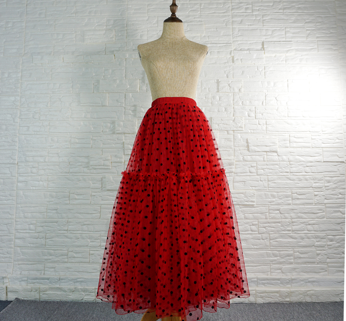 Women Red Long Tulle Skirt Red Wedding Bridesmaid Outfit High Waisted Custom Any Size Polka Dot Tulle Skirt