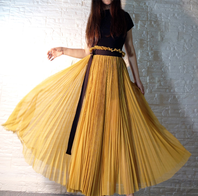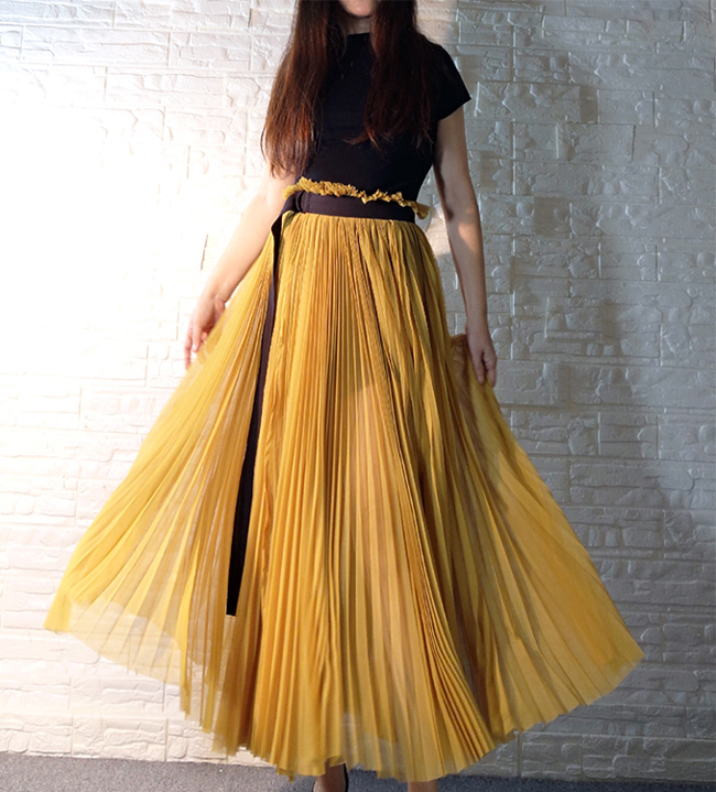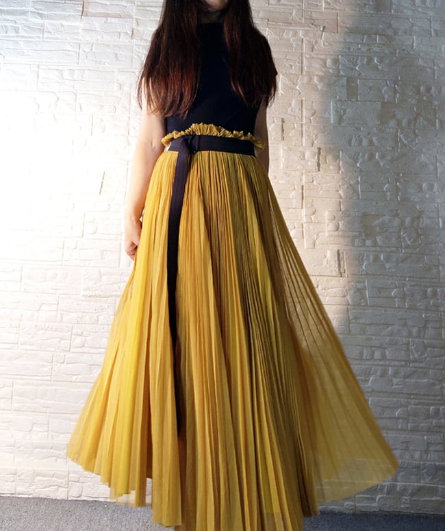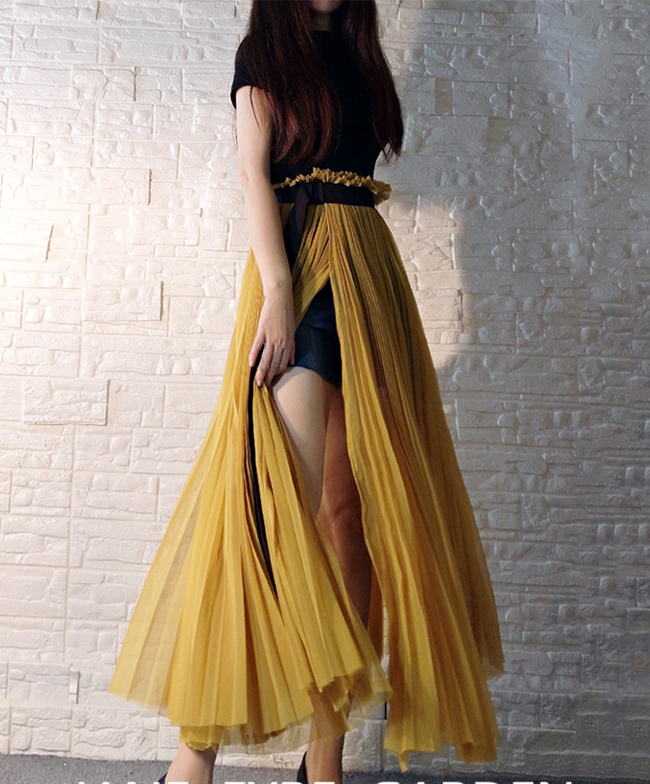 Women Yellow Slit Party Skirt Wedding Outfit High Waisted Tulle Maxi Skirt Custom Plus Size Pleated Long Tulle Skirt