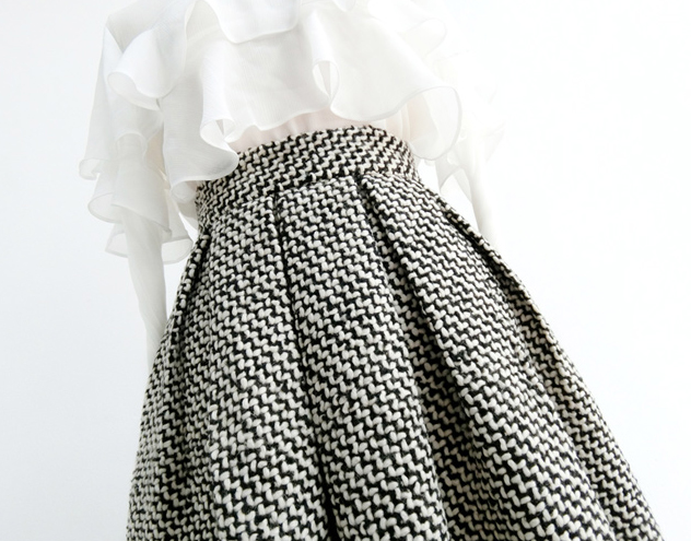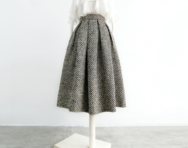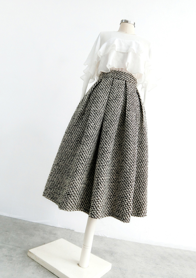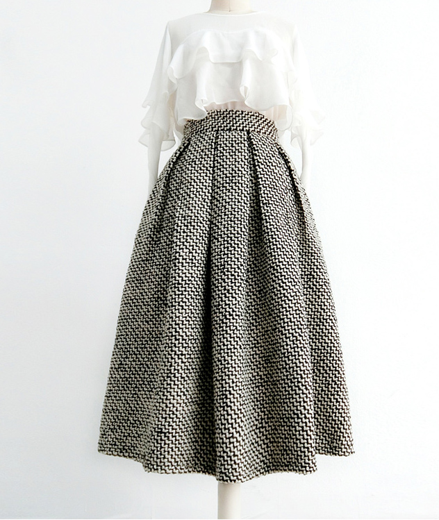 Women Black Tweed Midi Party Skirt A-line Black Pleated Party Skirt Outfit