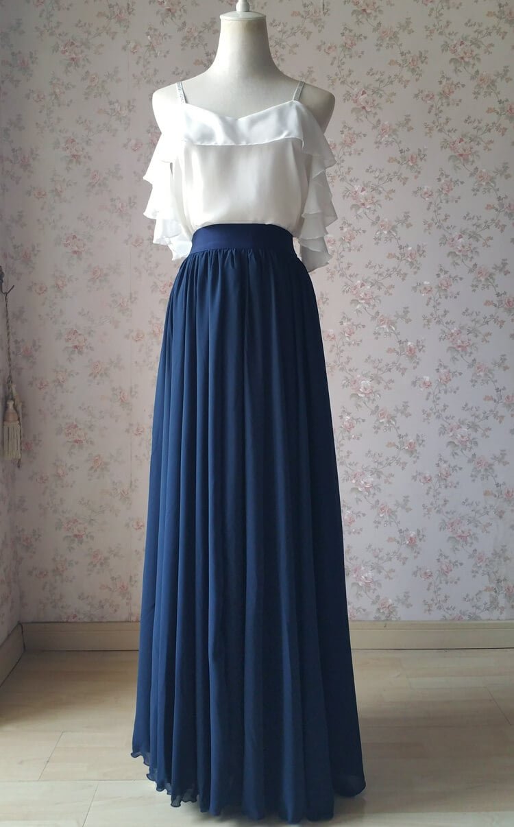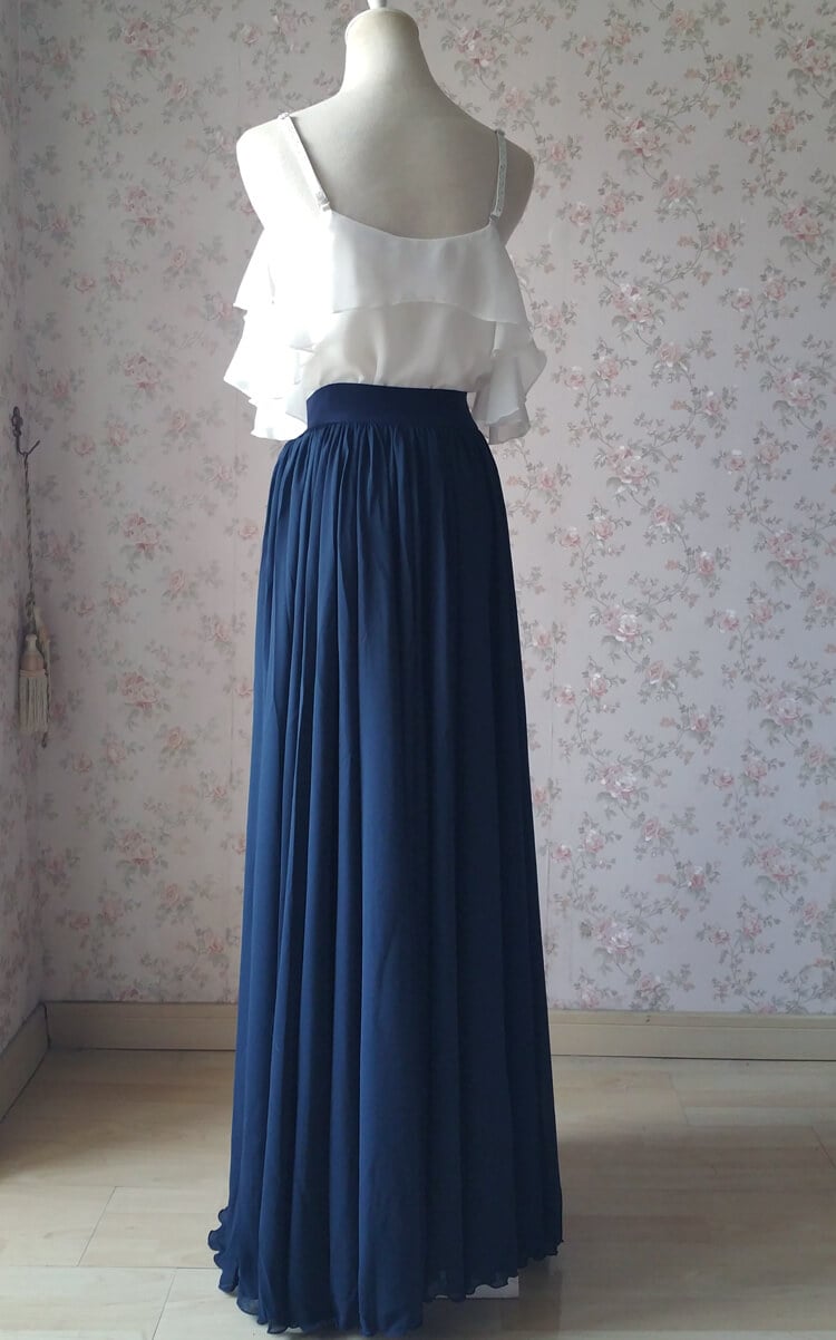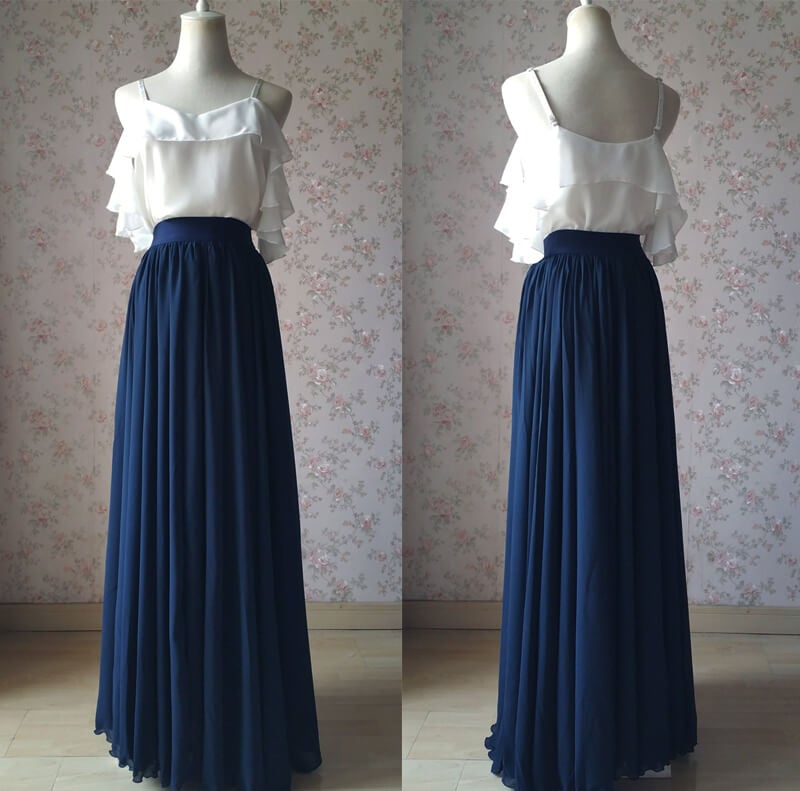 2020 Rustic Bridesmaid Dress Navy Maxi Chiffon Skirt White Ruffle Drape Chiffon Top Plus Size Rustic Bridesmaid Outfit