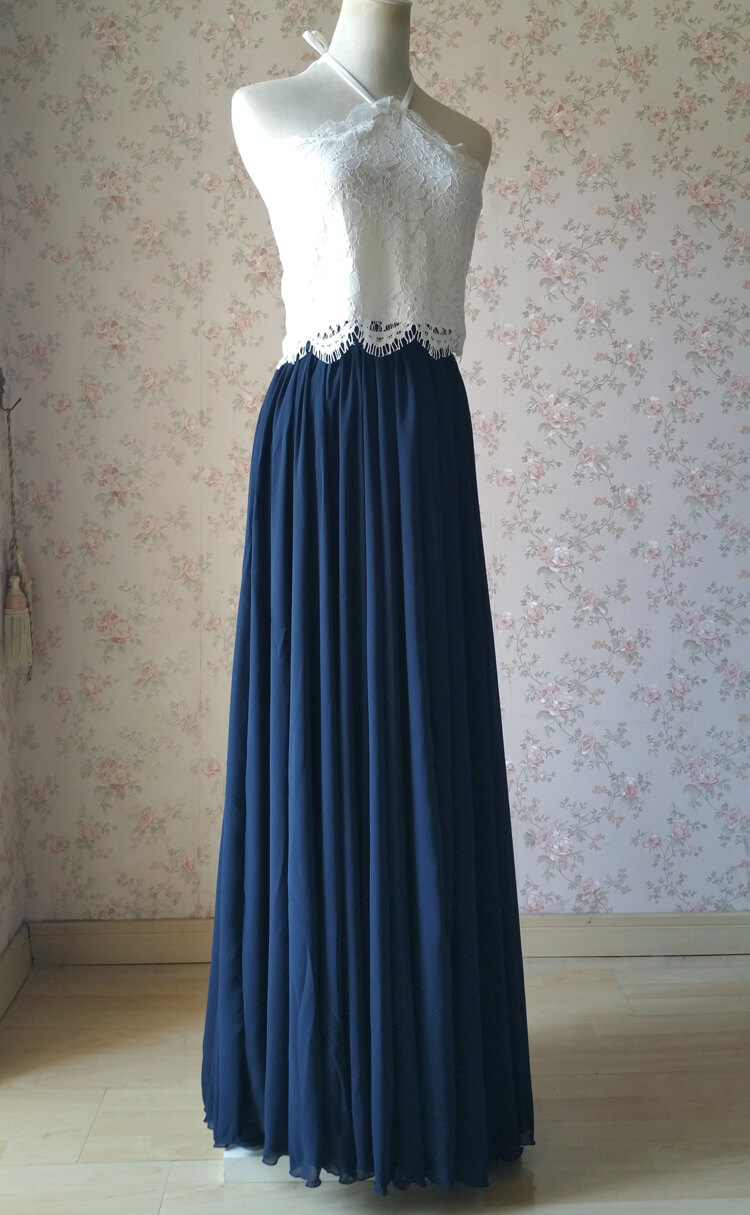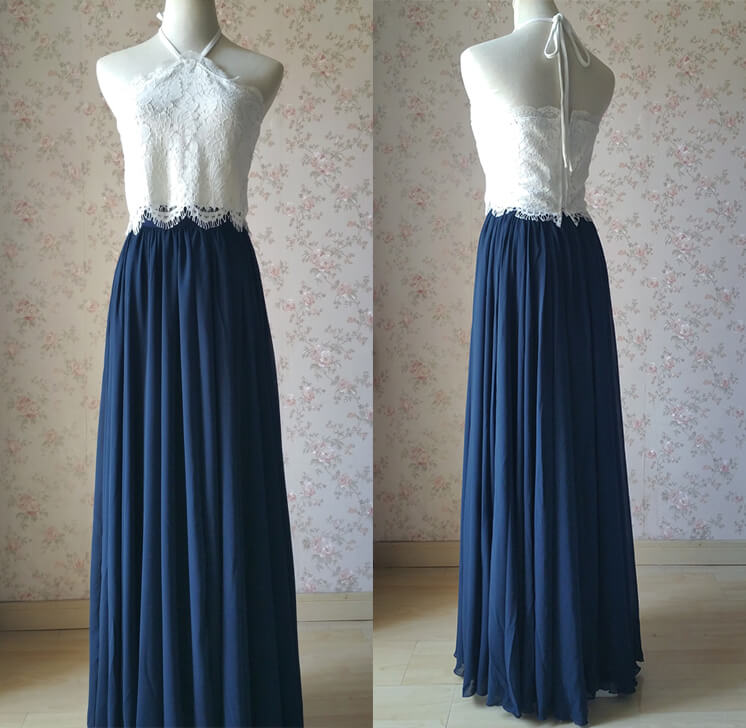 Two Piece Bridesmaid Dress Halter Neckline Lace Top Navy Maxi Chiffon Skirt Boho Wedding Dress Outfit