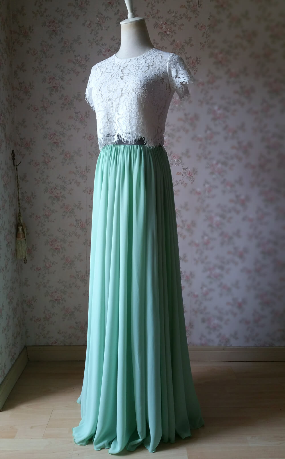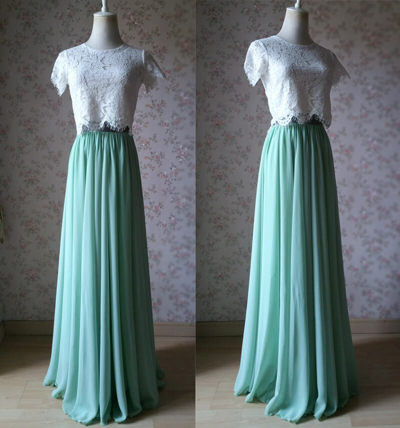 2 Pieces Bridesmaid Dress Chiffon Maxi Skirt Short Sleeve Crop Lace Top Rustic Bridesmaid Outfit Mint Green Long Chiffon Skirt Crop Lace Blouse