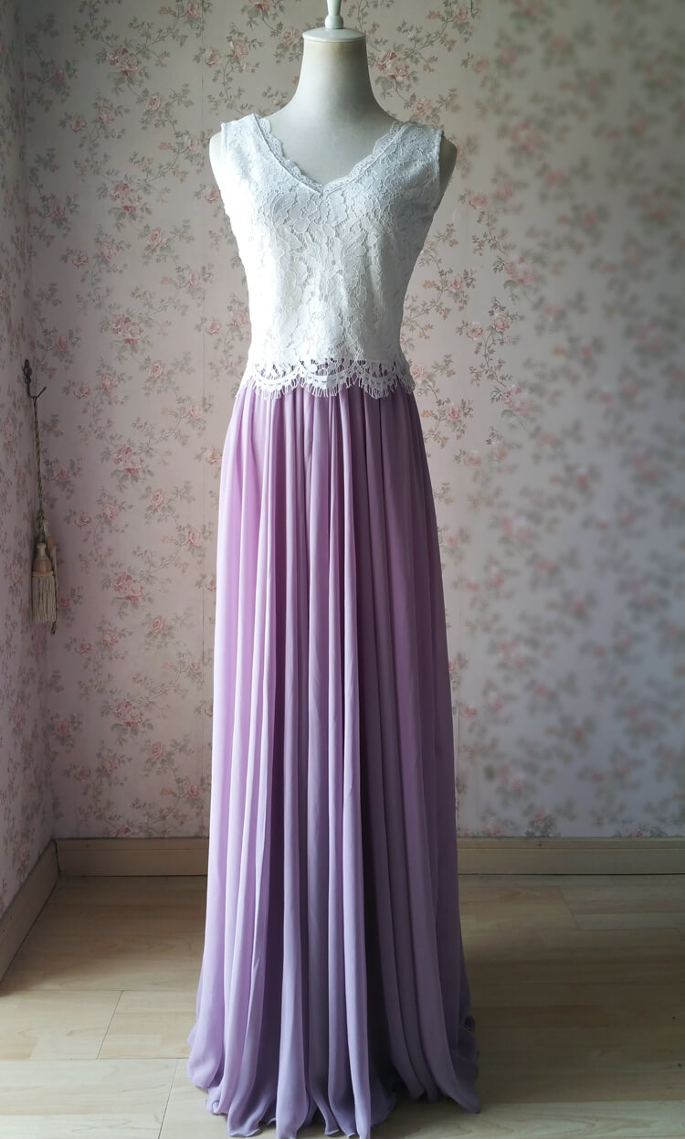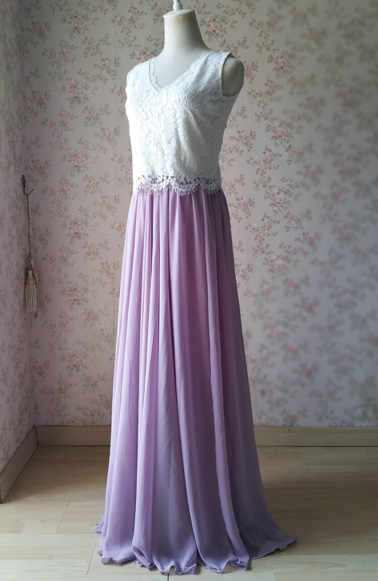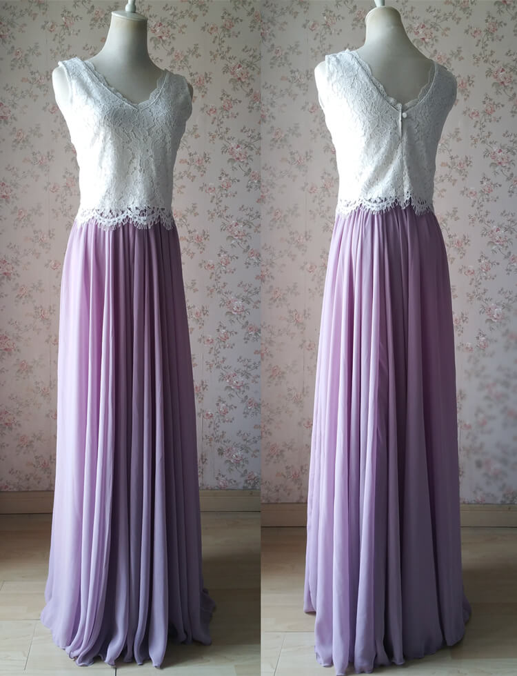 Two Piece Bridesmaid Dress Lavender Maxi Chiffon Skirt Lace Top 2-Piece Bridesmaid Dress Lavender Bridesmaid Outfit