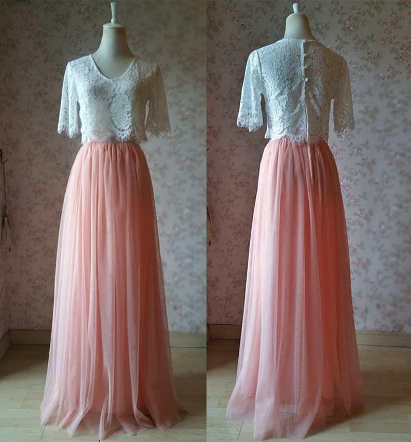 Two Piece Bridesmaid Dresses Long Tulle Skirt Sleeve Crop Lace Top Bridesmaid Outfit Peach Pink Bridesmaid Dresses