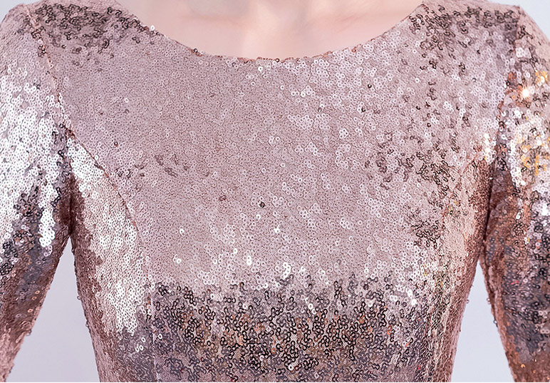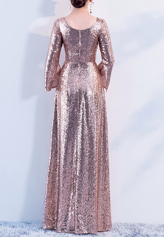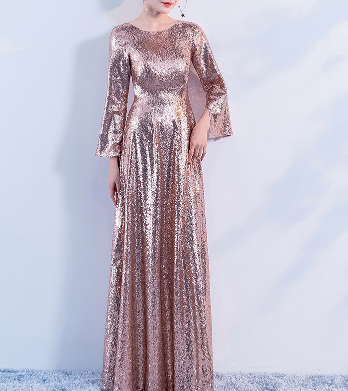 Rose-Gold Maxi Sequin Dresses, Women Maxi Sequin Evening Gown, Long Sleeve, Plus Size
