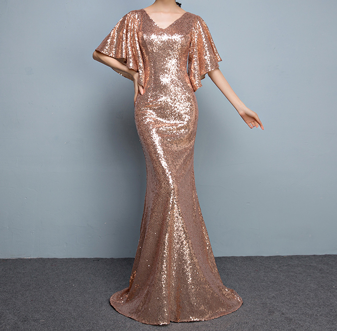 Rose-Gold Maxi Sequin Dresses, Bridesmaid Maxi Dresses, Sequin Evening Gown, Cap Sleeve, Custom Plus Size