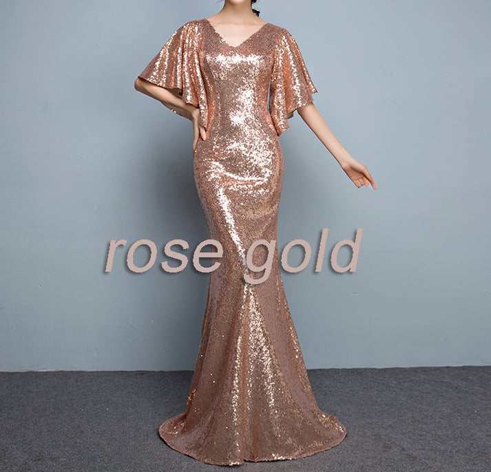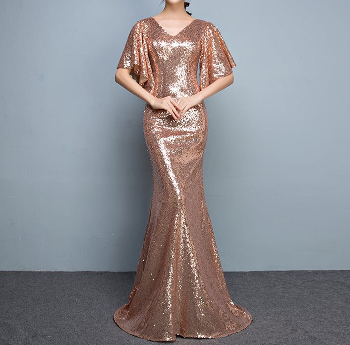 ROSE GOLD SEQUIN DRESS/ Mermaid Sequin Dress/ Custom Plus Size Sequin Dress/Sleeves Maxi Long Sequin Dress/ Wedding Dress/ Maxi Cocktail Party Dress