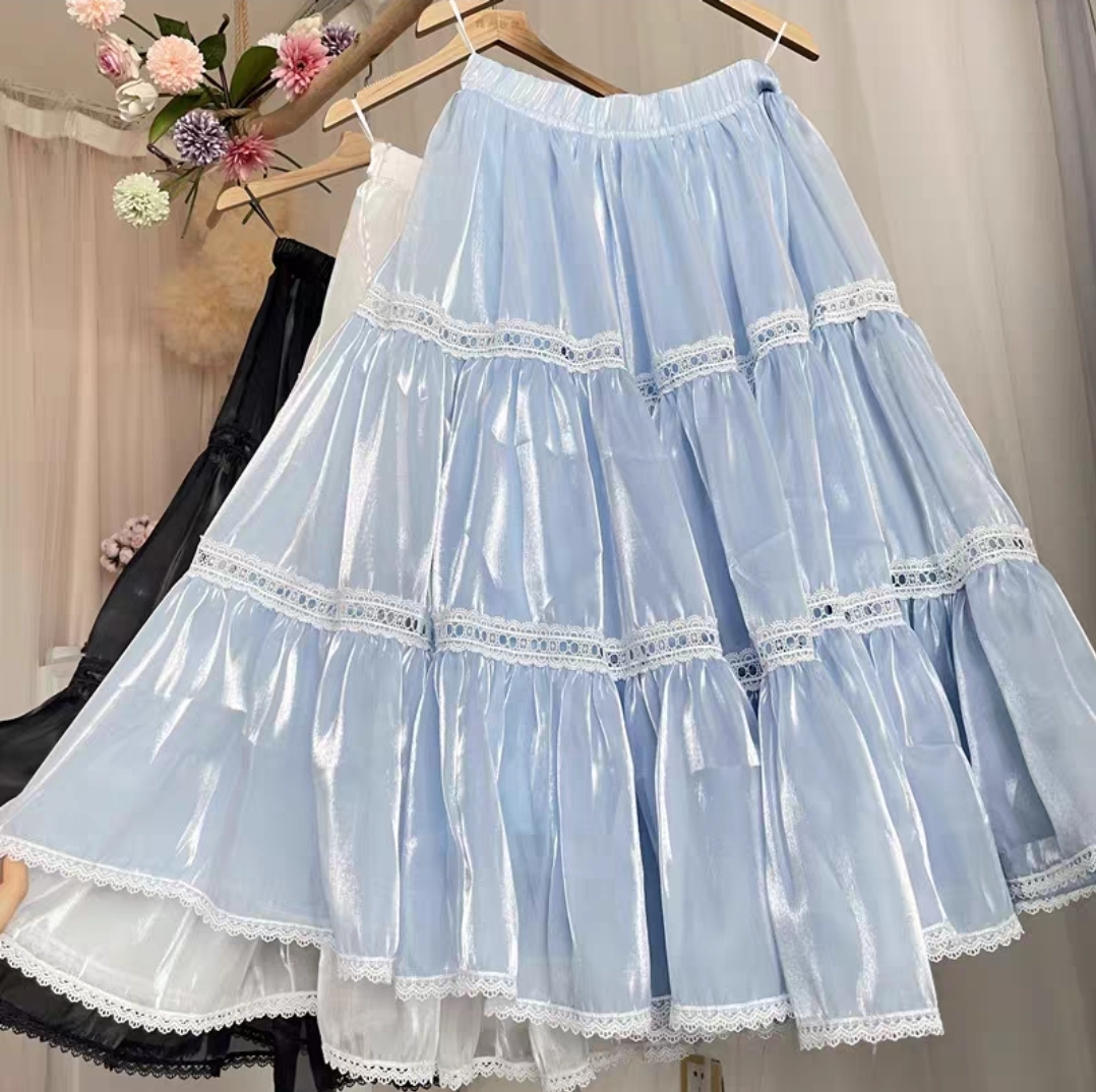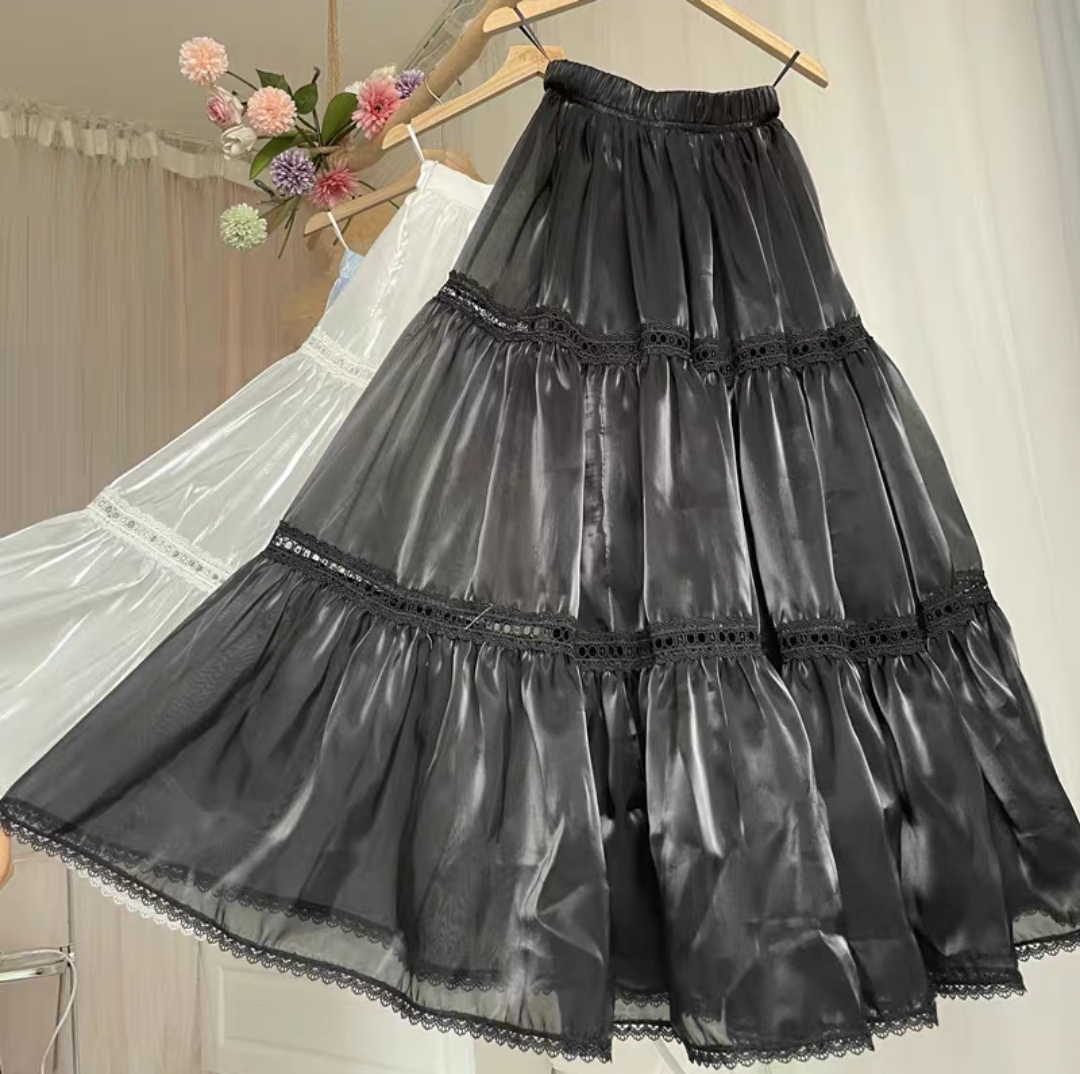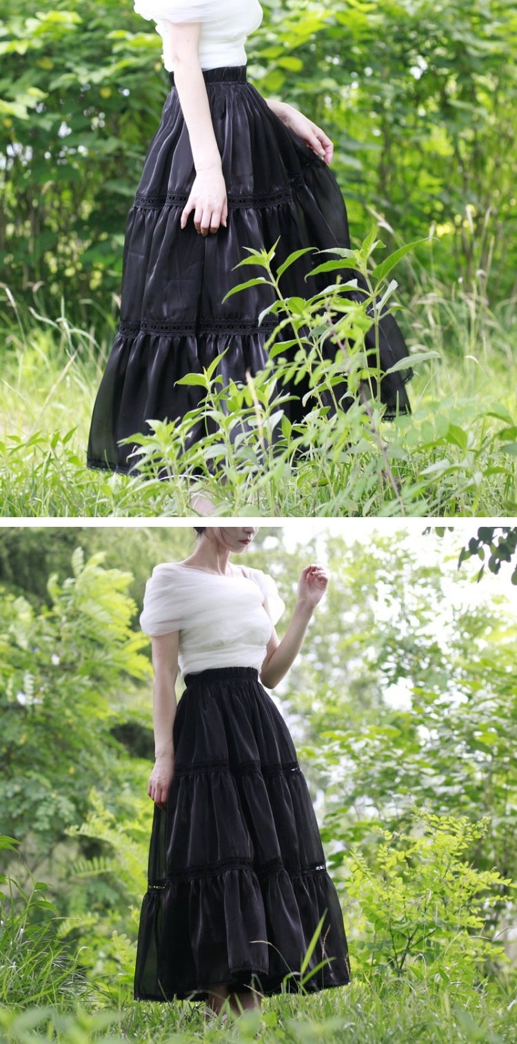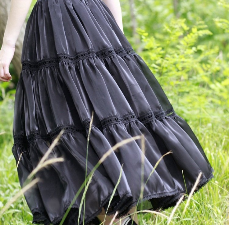 Black Layered Party Skirt Outfit Glossy Satin Midi Skirts Outfit Romanitc Layered Circle Ball Gown Skirt