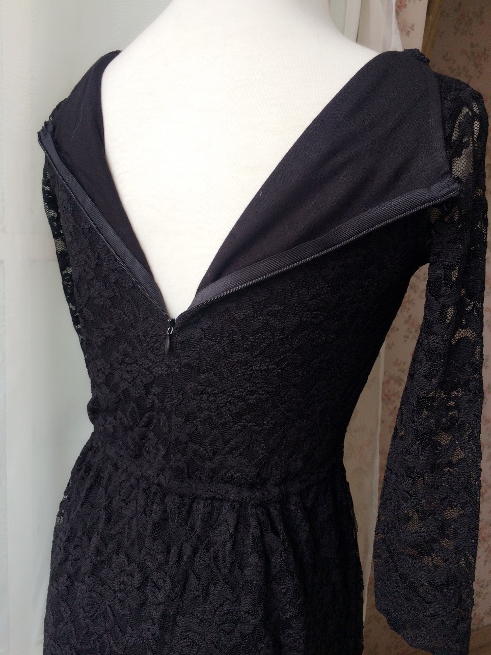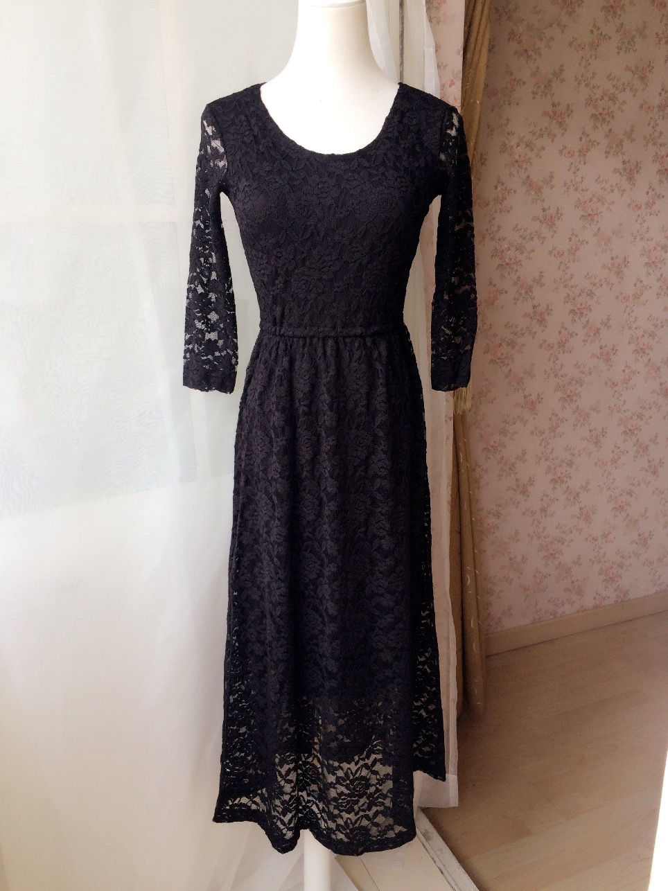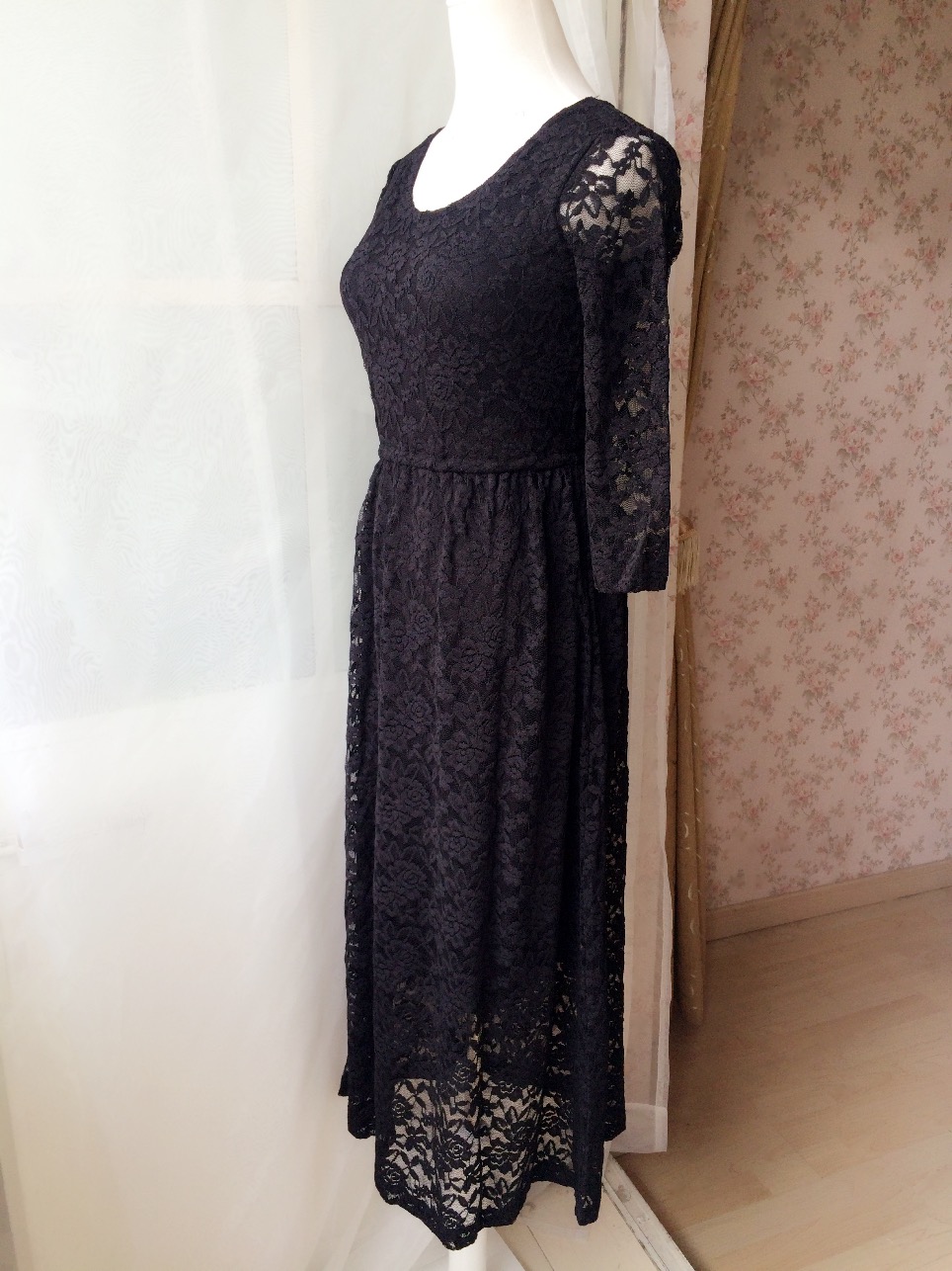 Black 3/4 Sleeve Long Lace Dress Round Neck High Waisted Lace Formal Dress Simple Black Lace Long Dress Custom Plus Size Retro Style