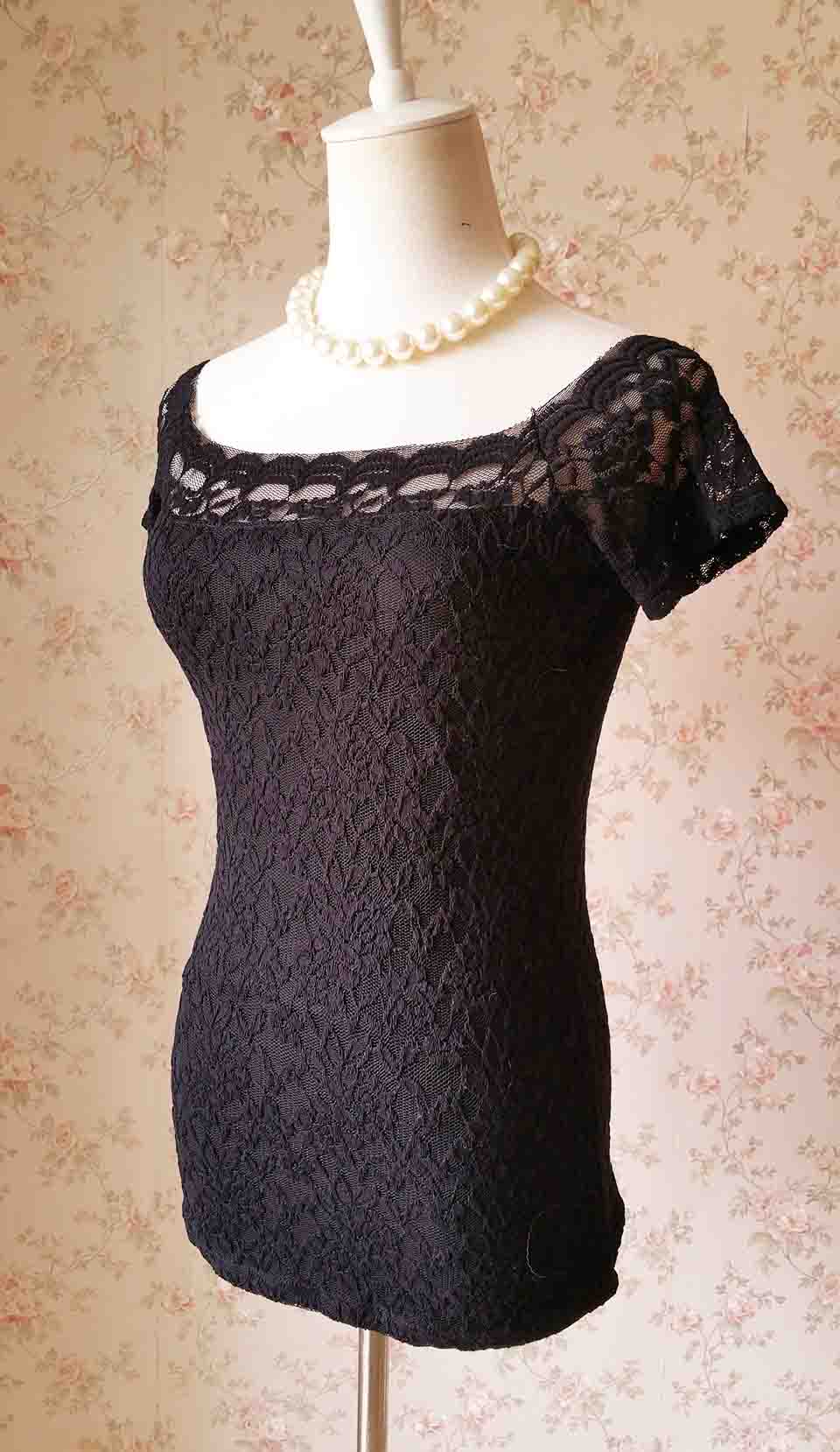 Black Off Shoulder Short Sleeve Lace TOPS Women Boat Neck Plus Size Lace Tops Custom