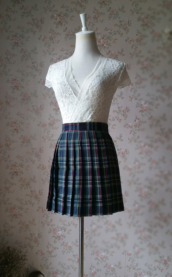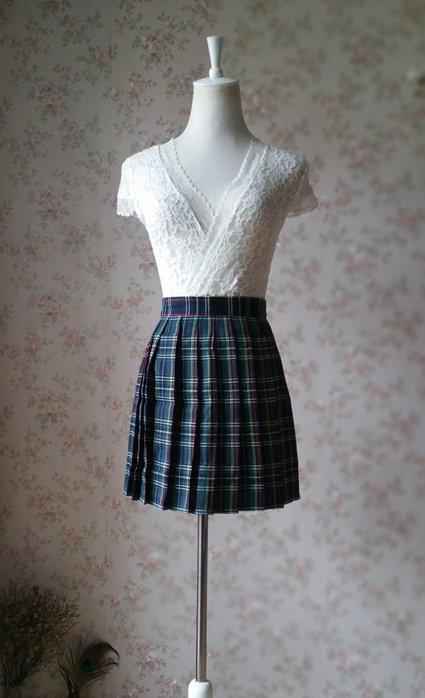 A-line Dark Green Plaid Skirt Outfit Plus Size Women Girl Short Pleated Plaid Skirt