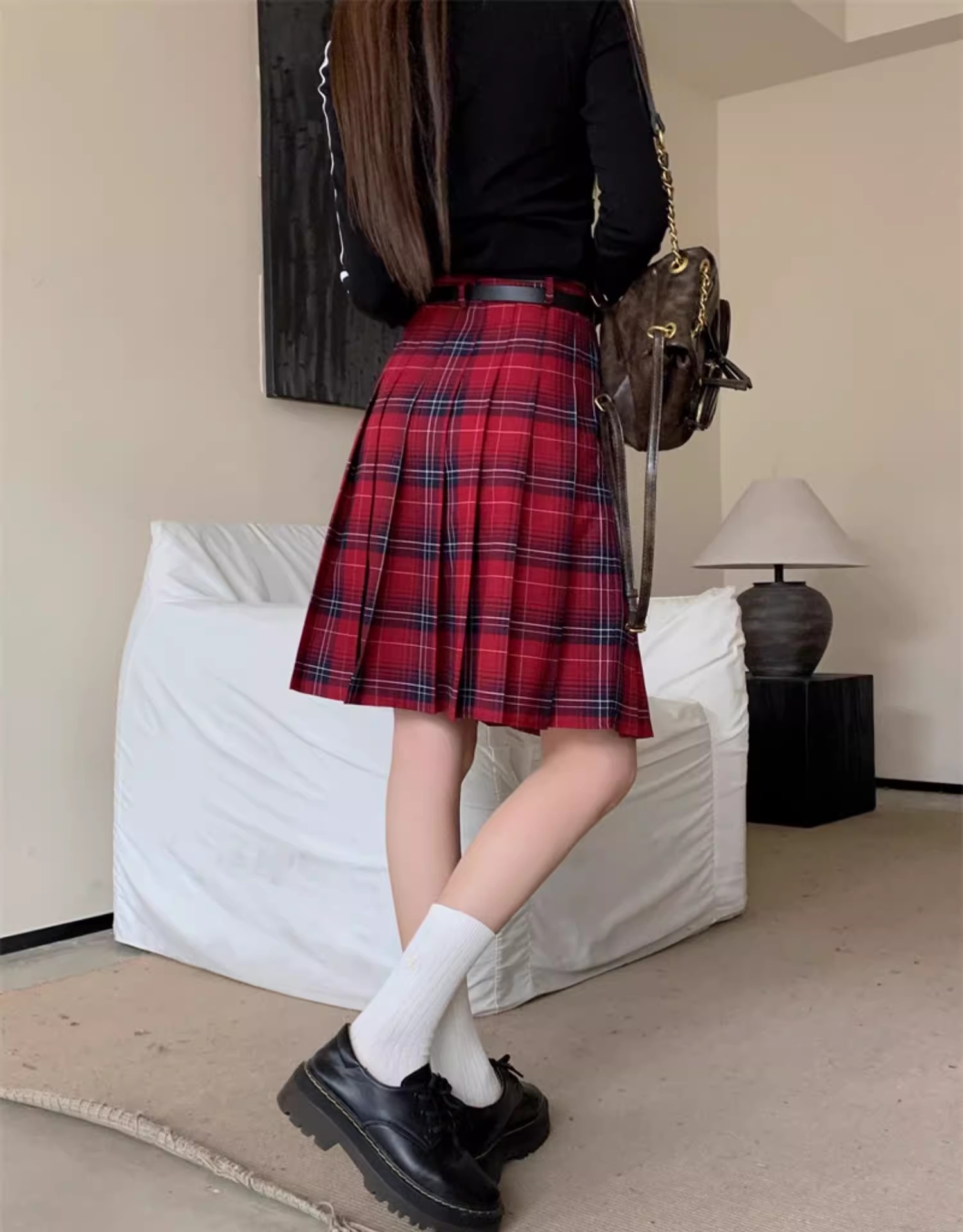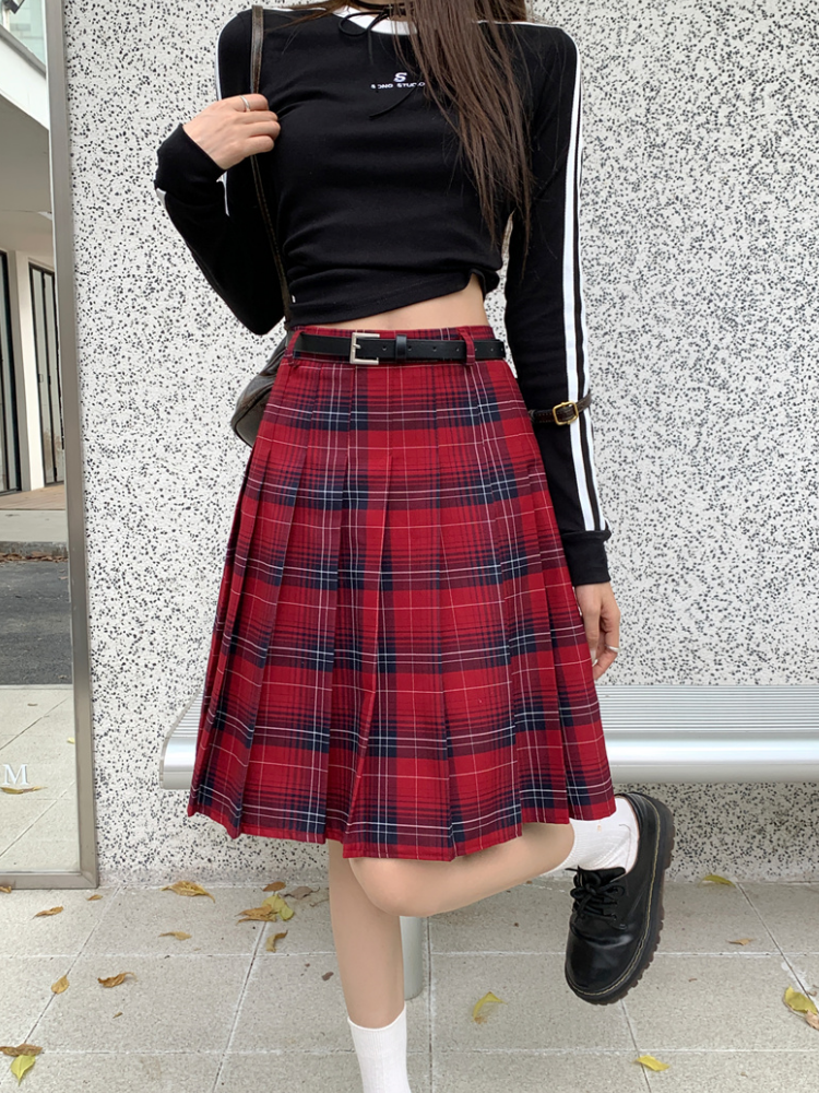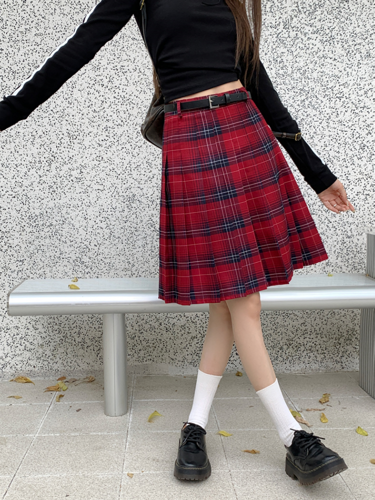 WOMEN RED PLAID SKIRT OUTFIT MIDI PLEATED PLAID SKIRT PLUS SIZE PLEATED PLAID SKIRT ELASTIC HIGH WAIST PLAID SKIRT CLASSY KNEE LENGTH PLAID SKIRT Holiday Outfit Fashion A-LINE SHORT PLEATED PLAID SKIRT