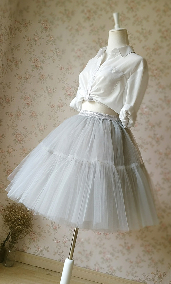 Women Light Gray Princess Skirt Full Midi Skirt Holiday Party Outfit NWT