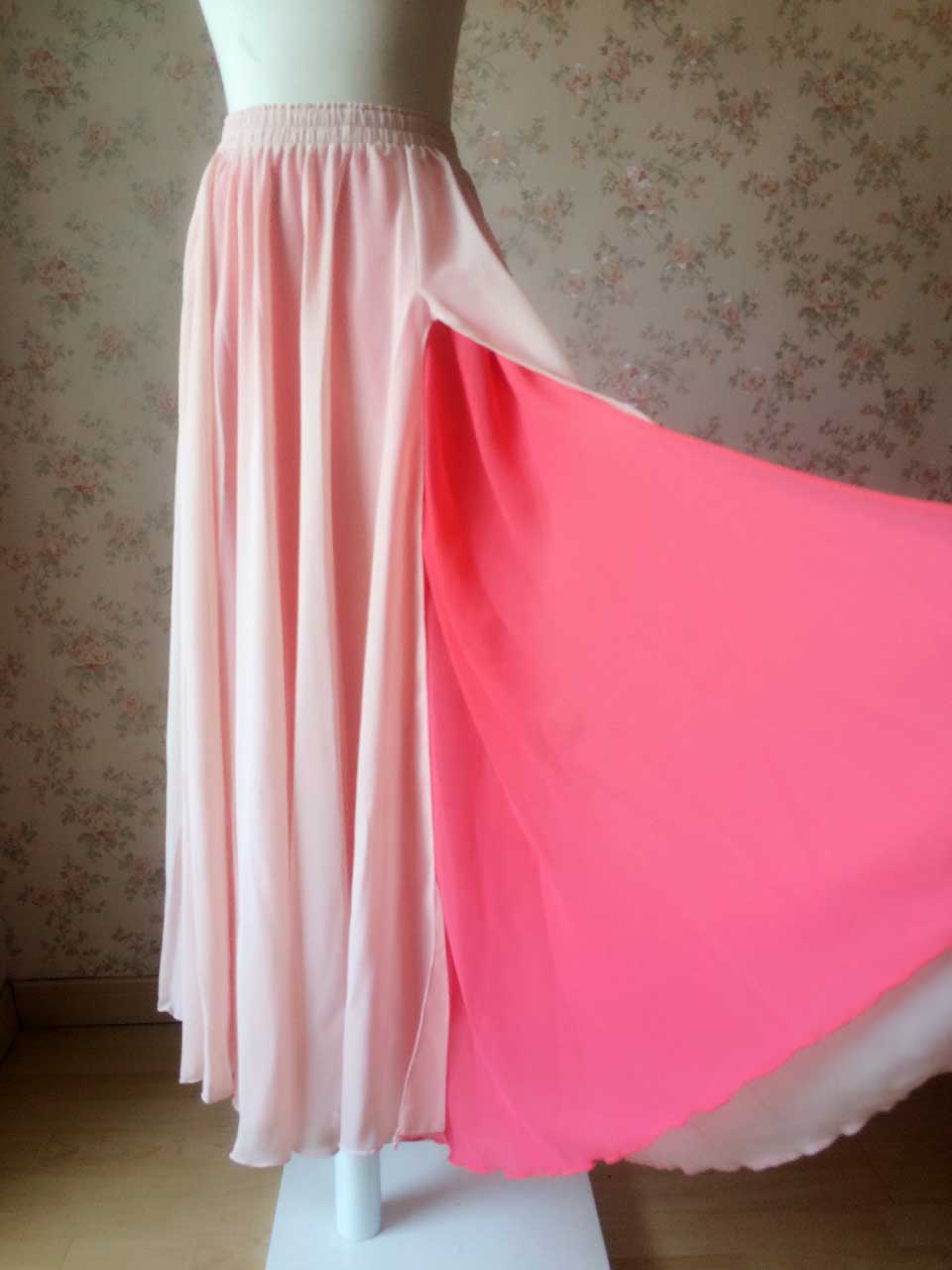 Women 2 Red Colors Elastic Waist 2 Layer Chiffon Split Skirts