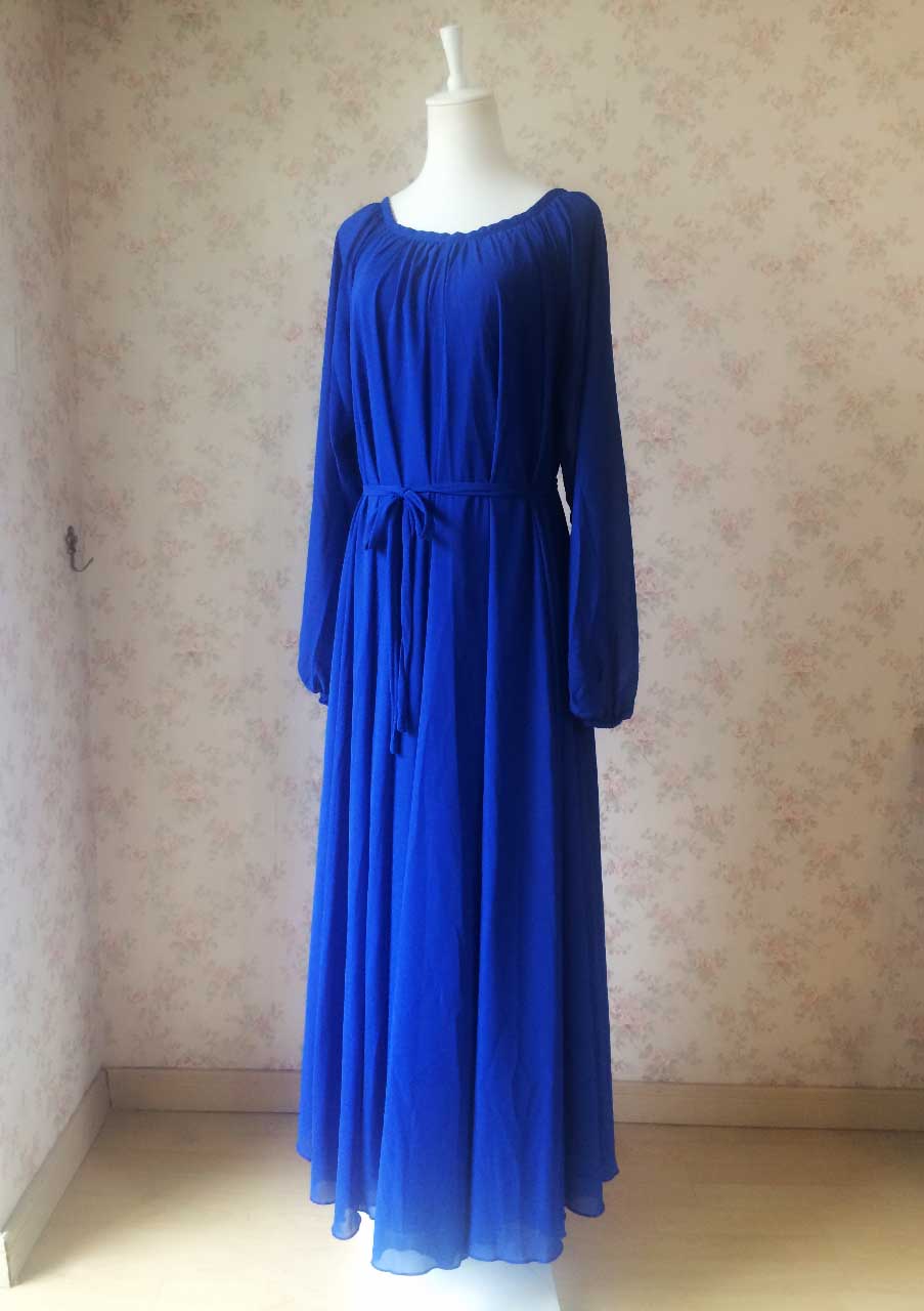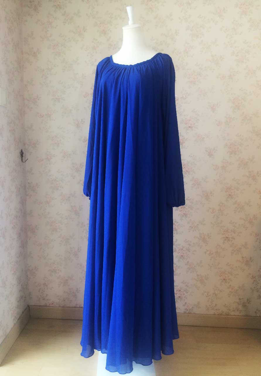 Women Royal Blue Long Sleeve Loose Maxi Chiffon Plus Size Chiffon Dress