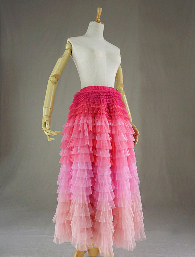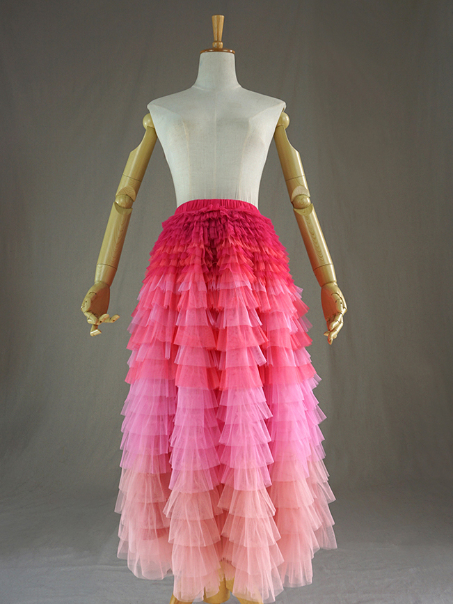 Red Pink Blush High Waist Tier Long Tulle Skirt Pink Party Skirt Wedding Skirt