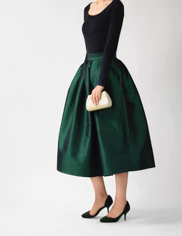 Black A-line Pleated Taffeta Skirt Ruffle Plus Size Pleated Skirt Emerald Green