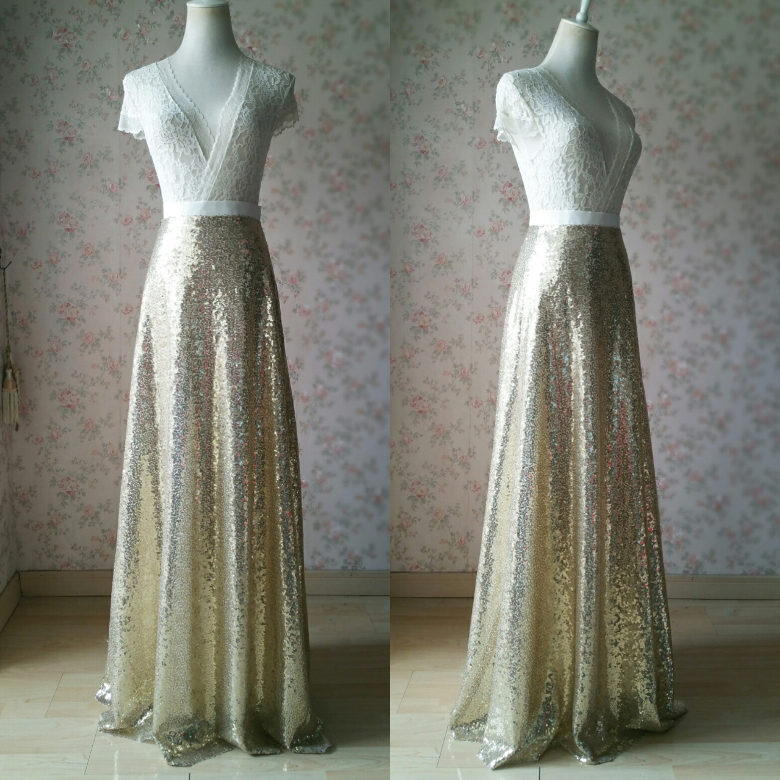 Gold Sequined Maxi Skirt Women Custom Plus Size Gold Sequin Skirt Wedding Guest Outfit