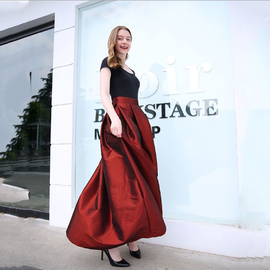 A-line Burgundy Ruffle Long Party Skirt Full Long Taffeta Skirt High Waisted with Pocket Burgundy Christmas Party Outfit