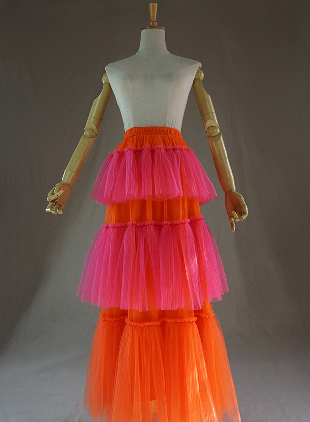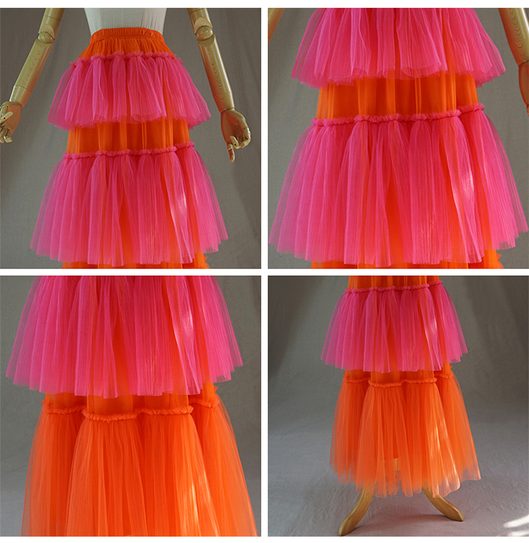 Women Tiered Tulle Skirt Tulle Tutu Costume Maxi Tulle Skirt Orange Red Mixture Tulle Skirt Outfit