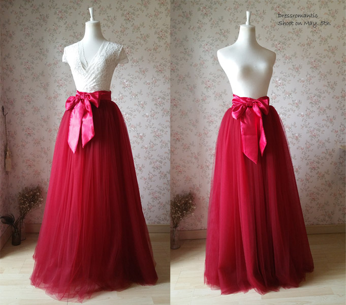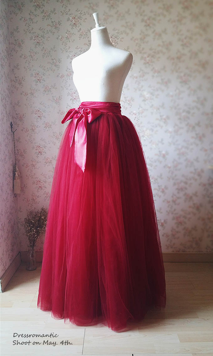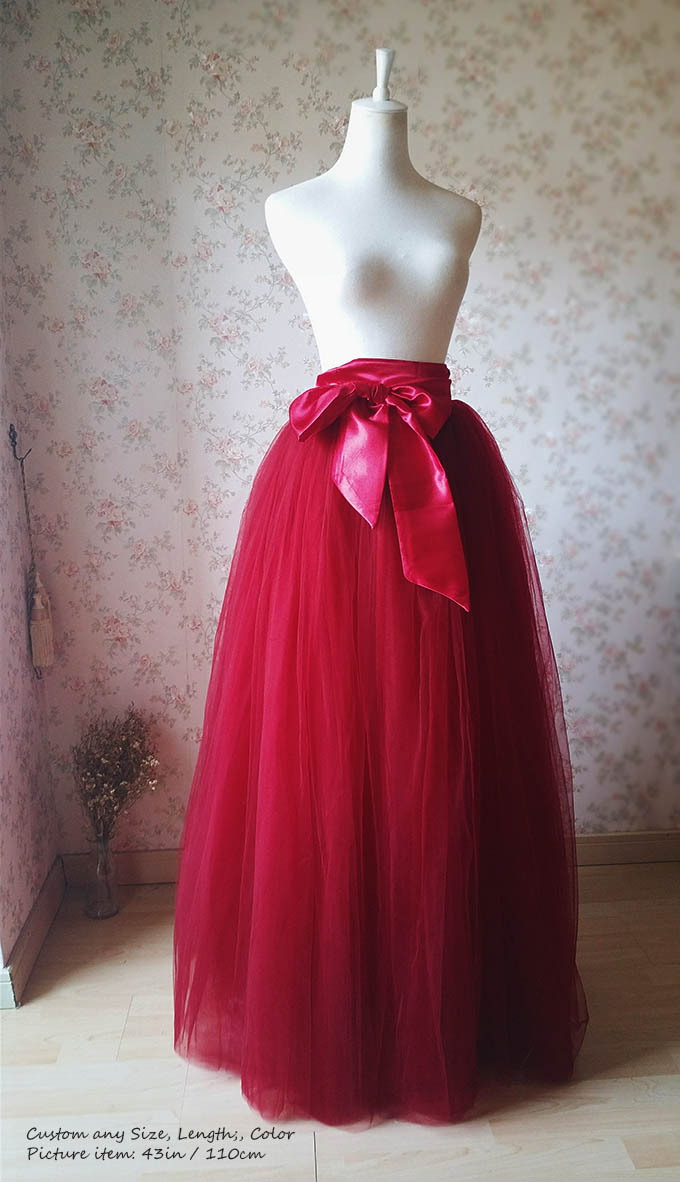 Women Maxi High Waisted Tulle Skirt Holiday Formal Skirt 6 Layer Maxi Tulle Tutu Skirt Plus Size Burgundy Wine Red