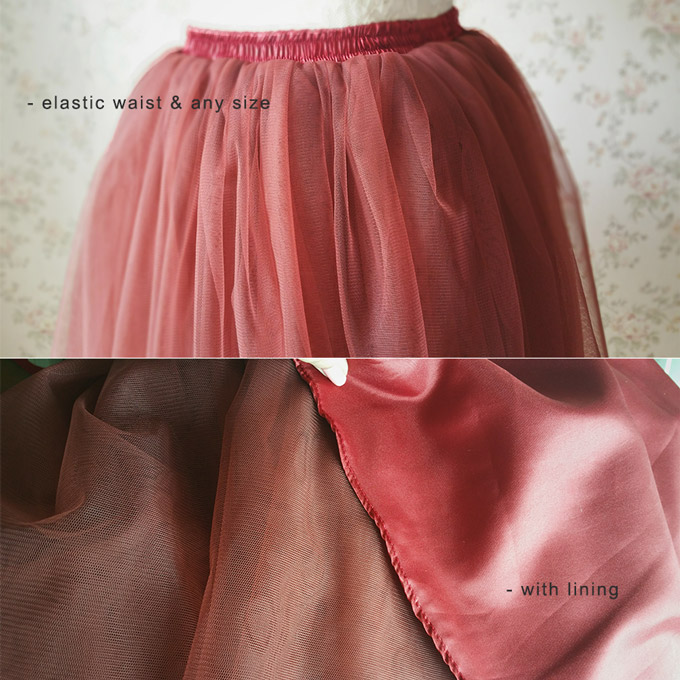 * This skirt is made from layers top quality tulle and one piece of imitating silk satin inner layer, which let the skirt looks so bouffant.