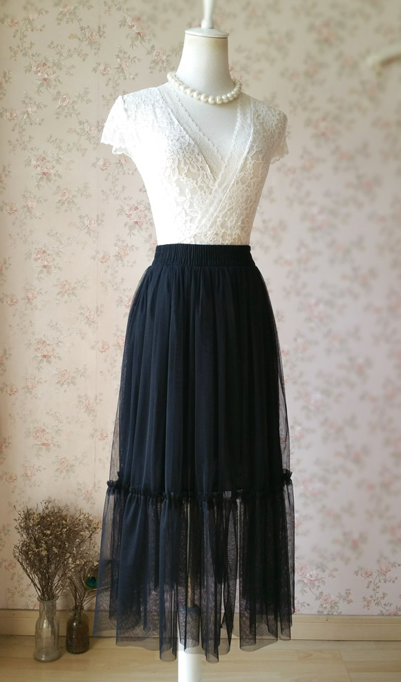 Women Black Midi Tulle Skirt Black Custom Plus Size 2 Layered Tulle Midi Skirt Elastic Tulle Mesh Skirt