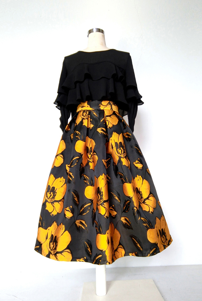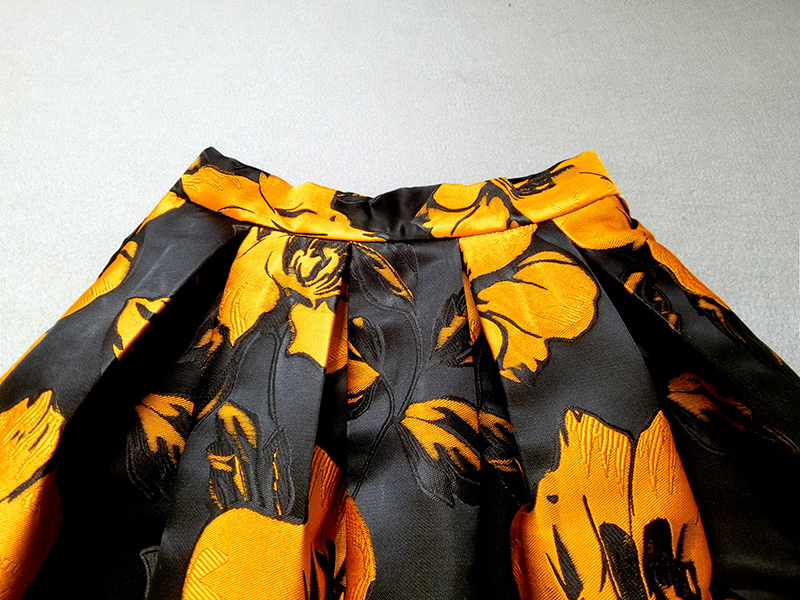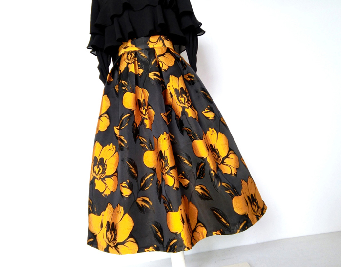 YELLOW FLOWER A-line Midi Skirt Pleated Skirt with 50s Style Skirts is easily match any tops. The bright yellow flower pattern can look still fashionable and elegant.