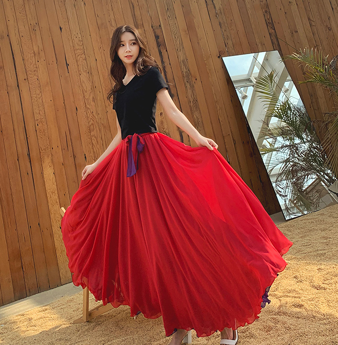 Women's High Waist Chiffon Maxi Skirt Purple Red Two Colors Long Chiffon Skirt with Belt Party Chiffon Skirt Evening Skirt