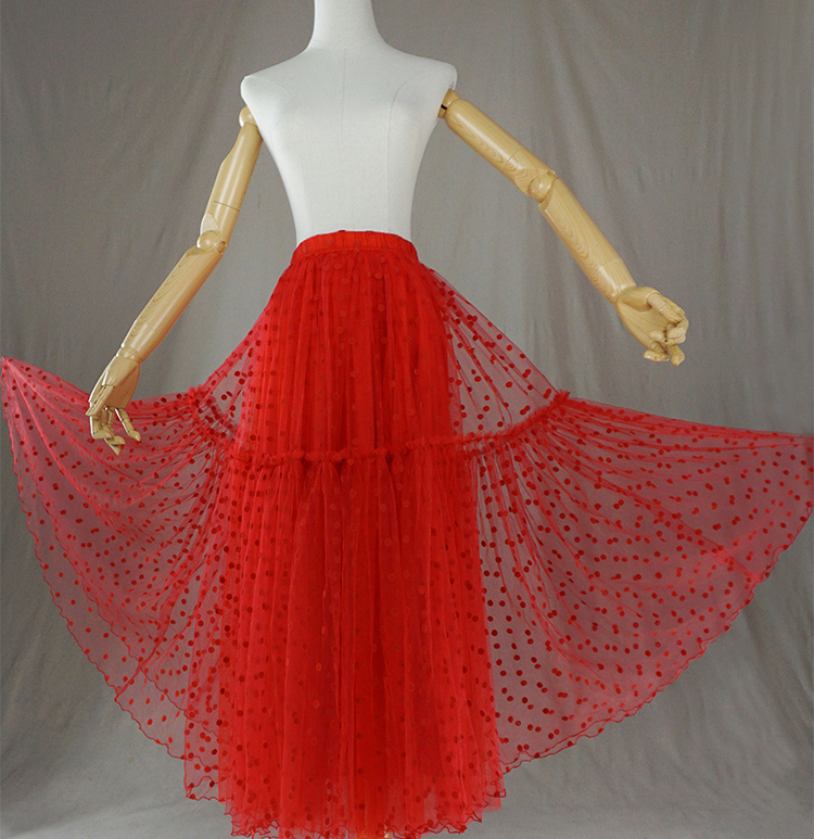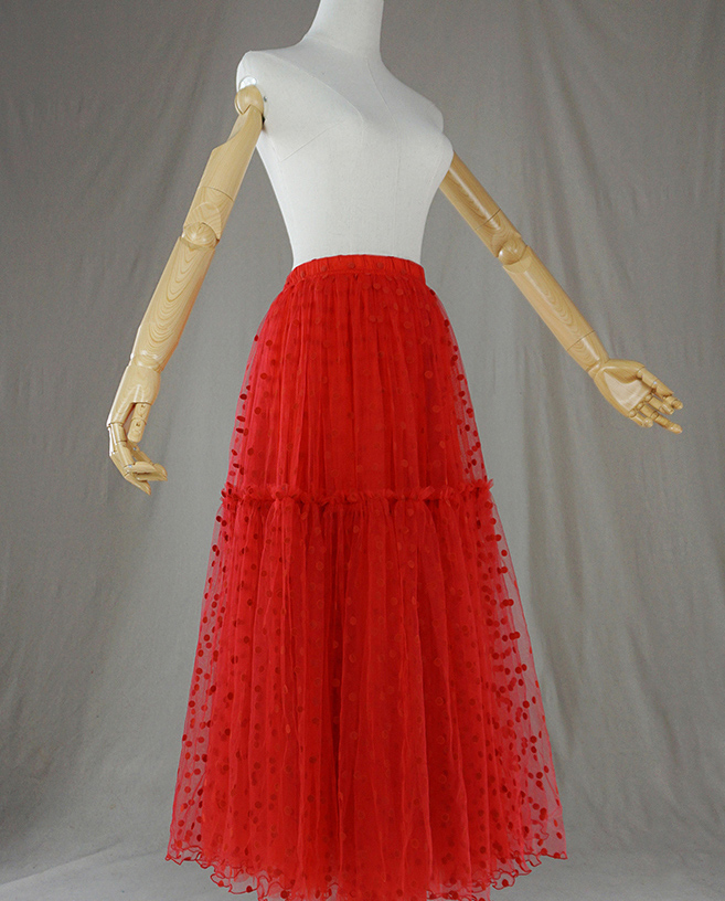Red Polka Dot Tutu Tulle Skirt Women A-line Puffy Tulle Outfit Red Dot Party Tulle Skirt Plus Size High Waist Layered Tulle Skirt