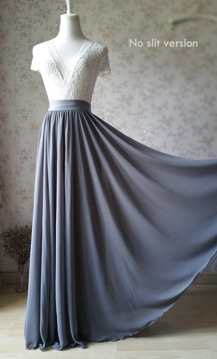 GRAY High Waisted Chiffon Maxi Skirt Gray Floor Length Wedding Skirt Outfit Gray Bridesmaid Skirt Women A-line Chiffon Slit Skirt Summer Wedding Bridesmaids Slit Skirt Outfit Custom Plus Size Maxi Chiffon Skirt Handmade Gray Maxi Skirt Beach Skirt.