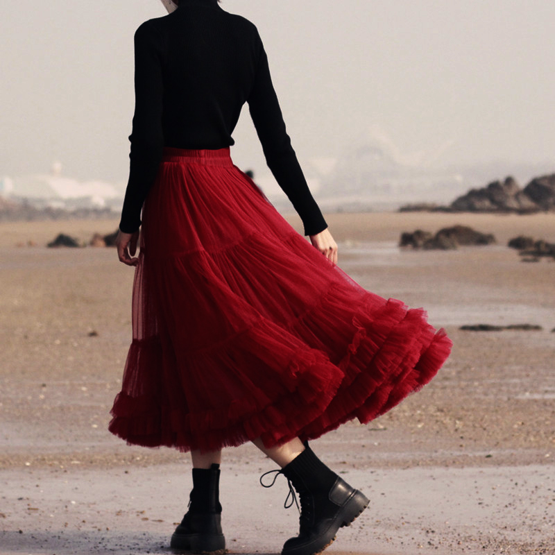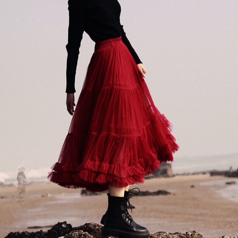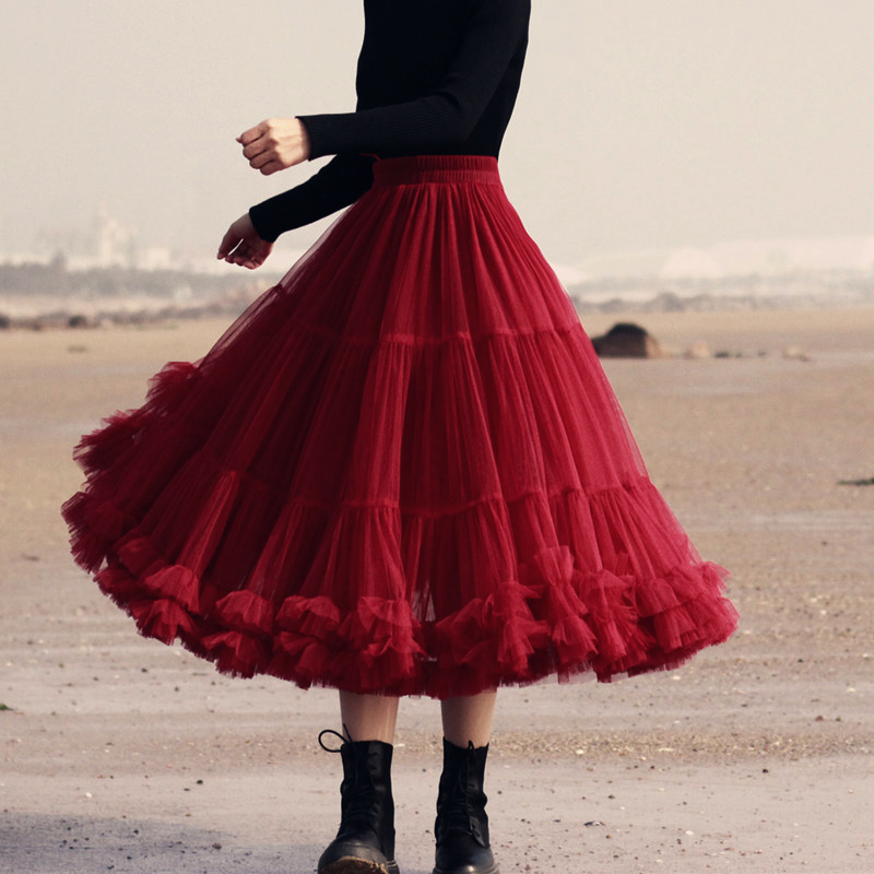 Women Wine Red Midi Tulle Skirt High Waist Plus Size Tulle Midi Skirt Holiday Skirt Outfits Burgundy Wedding Outfit
