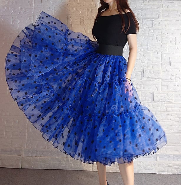 Women Royal Blue Polka-Dot Tulle Skirt Party Midi Skirt High Waisted A-line Layered Polka Dot Skirt Outfit Plus Size Puffy Midi Skirt