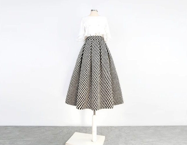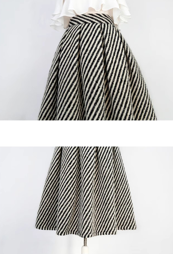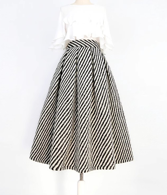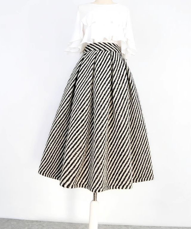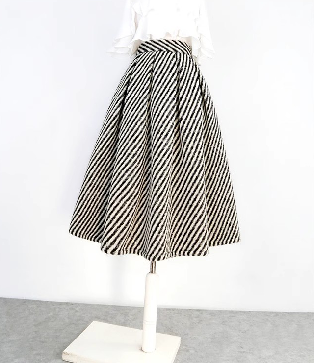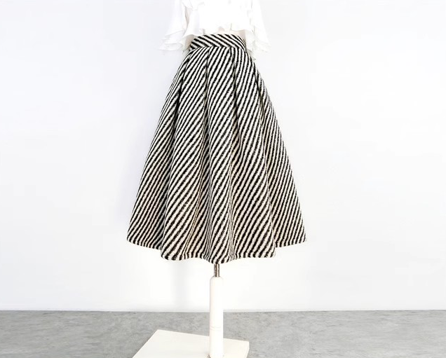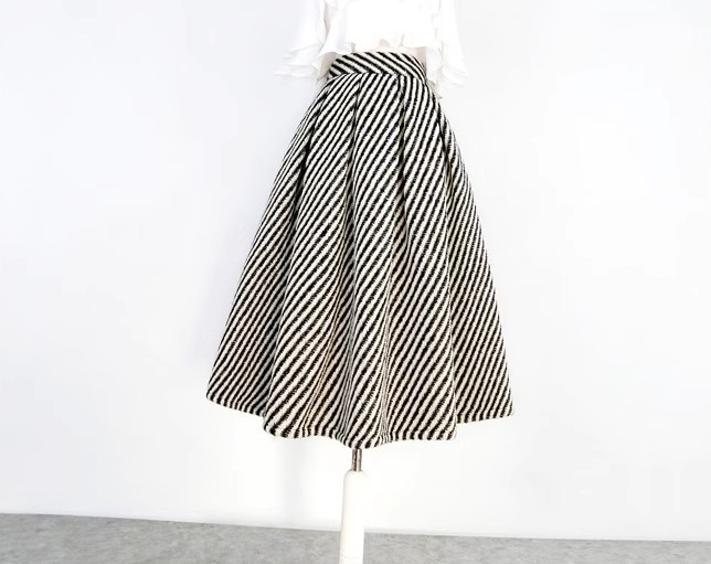 Winter Pleated Party Skirt WHITE BLACK STRIPED MIDI SKIRT Custom PLUS Size Pleated Midi Length Skirt Outfit ELEGANT HIGH WAISTED NAVY STYLE MIDI Party Skirt for women is our shop's new items, easily match any tops, best choices for winter holidays.