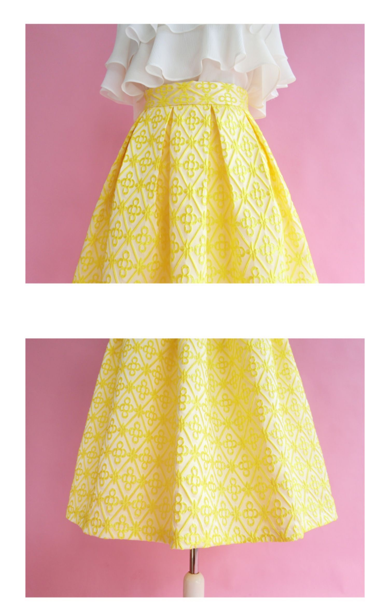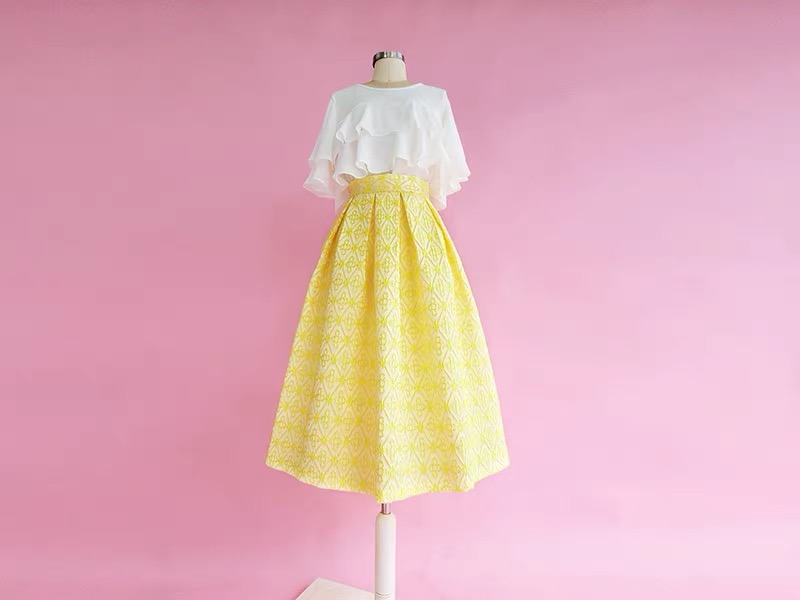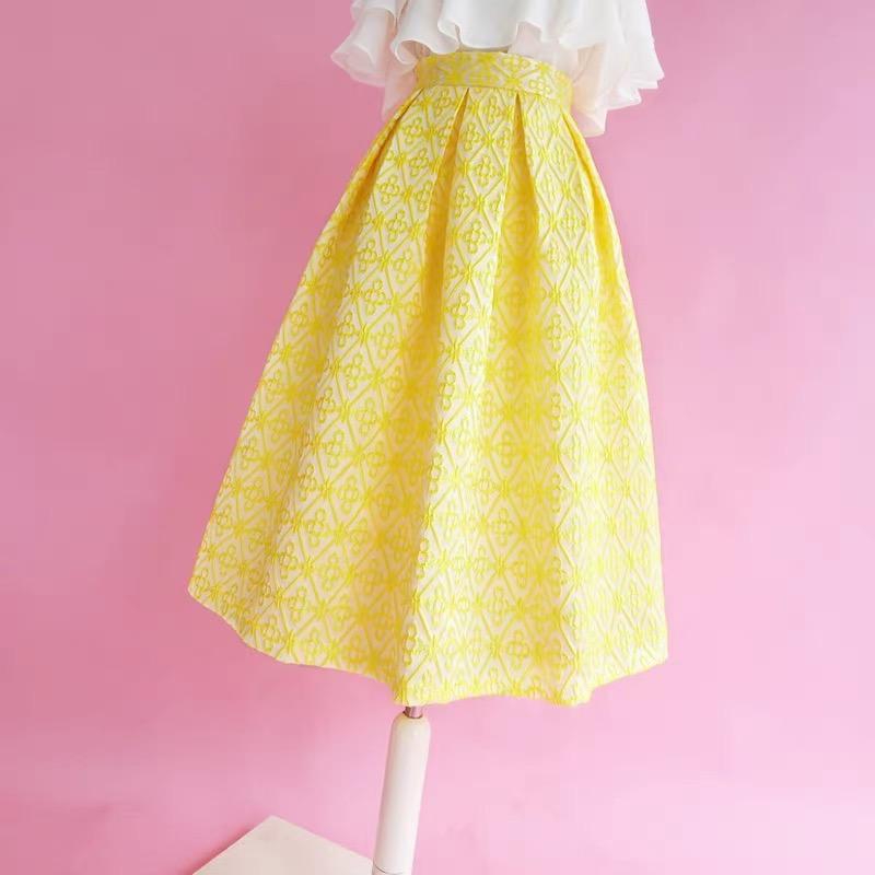 Romantic Yellow Midi Skirt Outfit Plus Size Yellow Pleated Midi Party Skirt Holiday Outfit