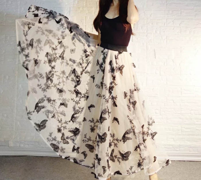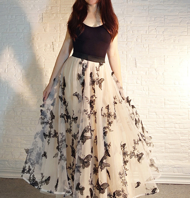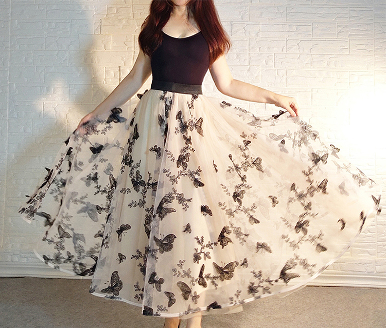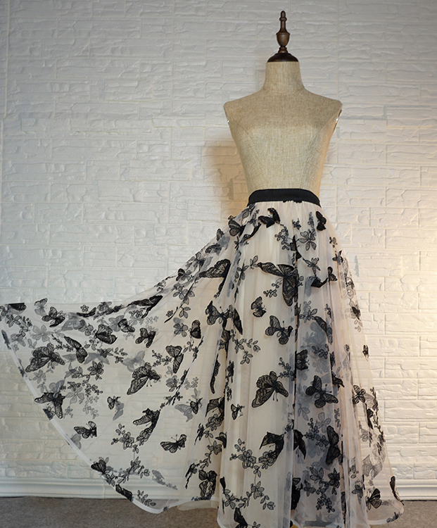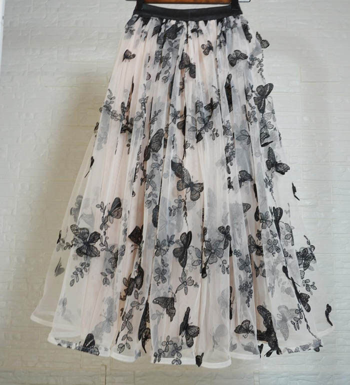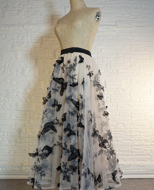 Women Champagne Long Tulle Skirt Outfit High Waisted Lace Tulle Maxi Skirt Plus Size Butterfly Embroidery