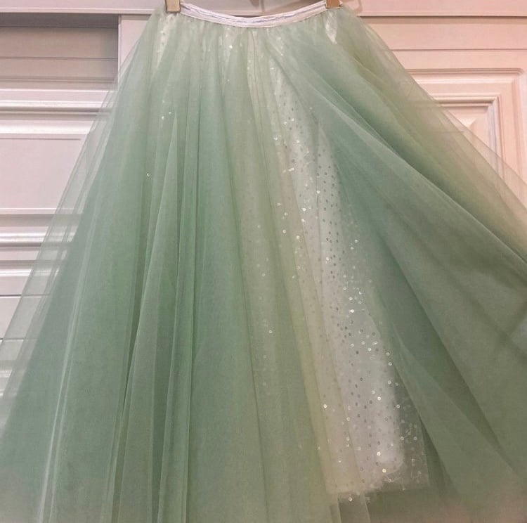 This tulle skirt is made from many layered soft and light Tulle underneath a layer sliver sequin and one layered imitating soft satin lining.