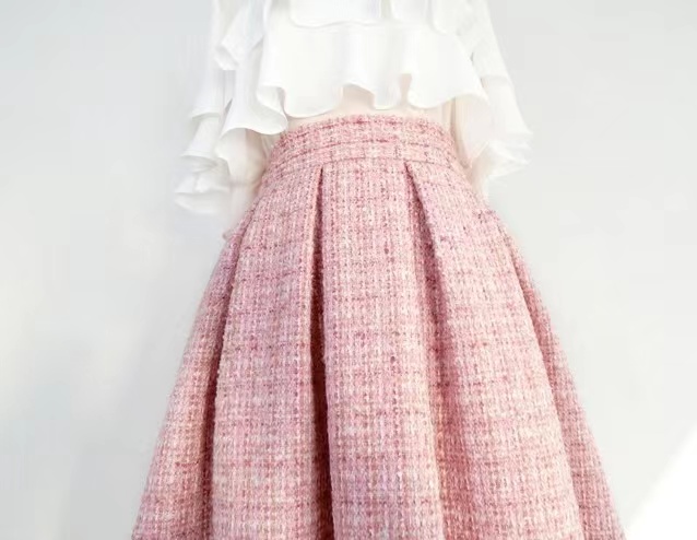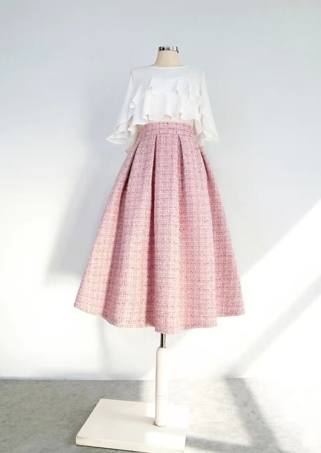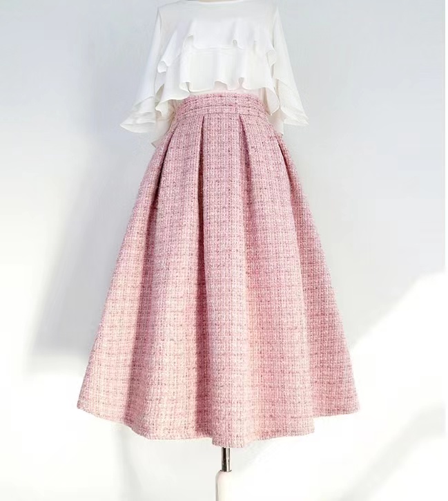 Romantic Baby Pink Woolen Skirt Pleated Midi Holiday Skirt Warm Midi Party Skirt Plus Size Christmas Outfit