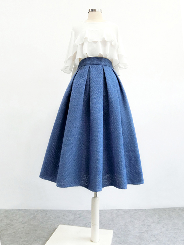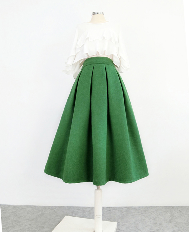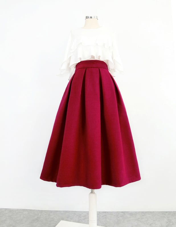 * This tea length pleated skirt is made of wool cotton with romantic element.