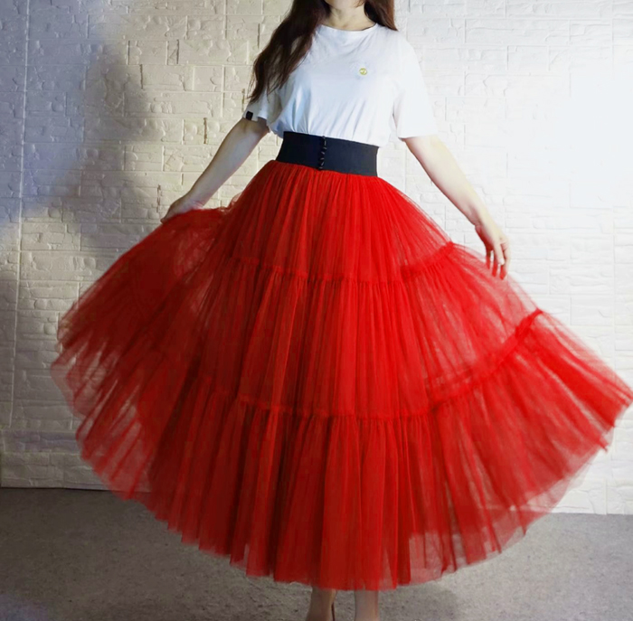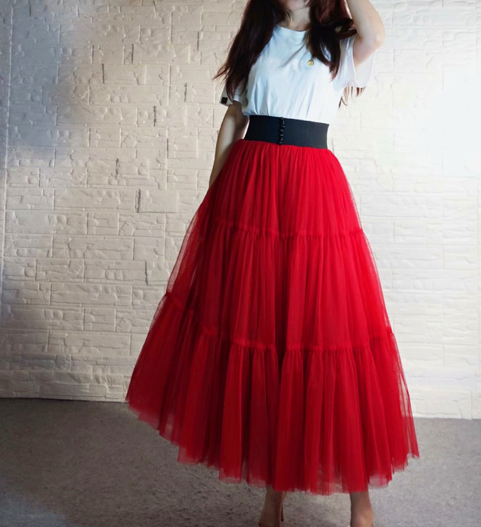 Red Tiered Tulle Skirt Full Long Red Party Outfit High Waisted Custom Any Size Elegant Tulle Skirt