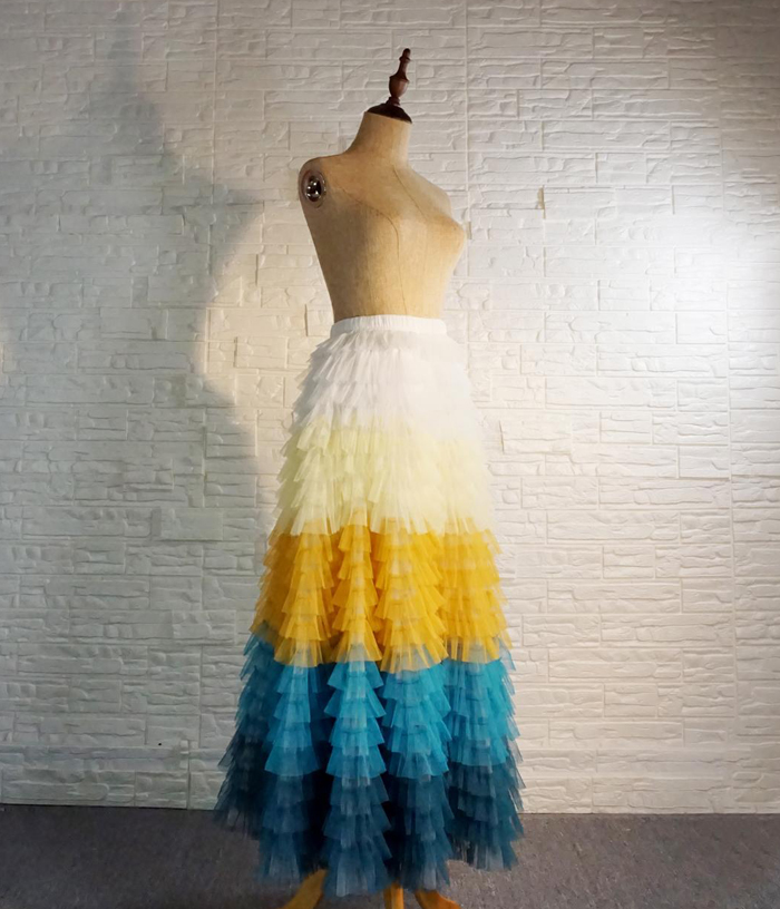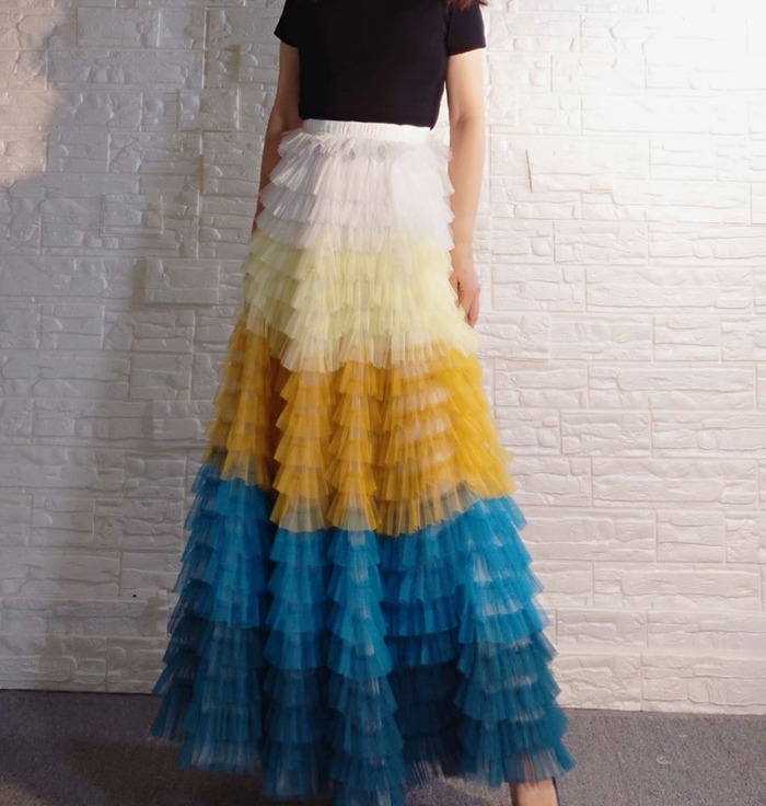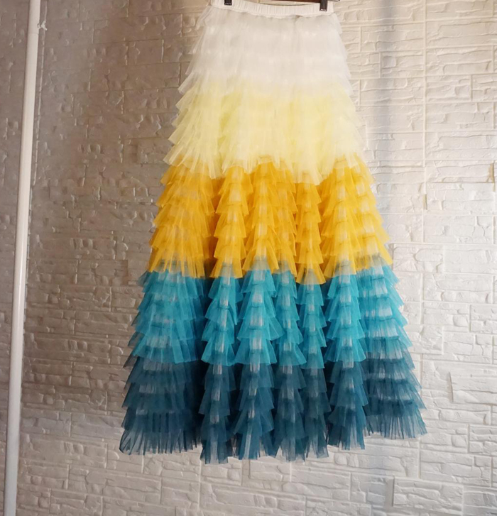 Yellow Blue Layered Tulle Skirt Party Outfit High Waisted Wedding Floor Length Tulle Skirt Custom Plus Size
