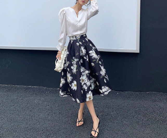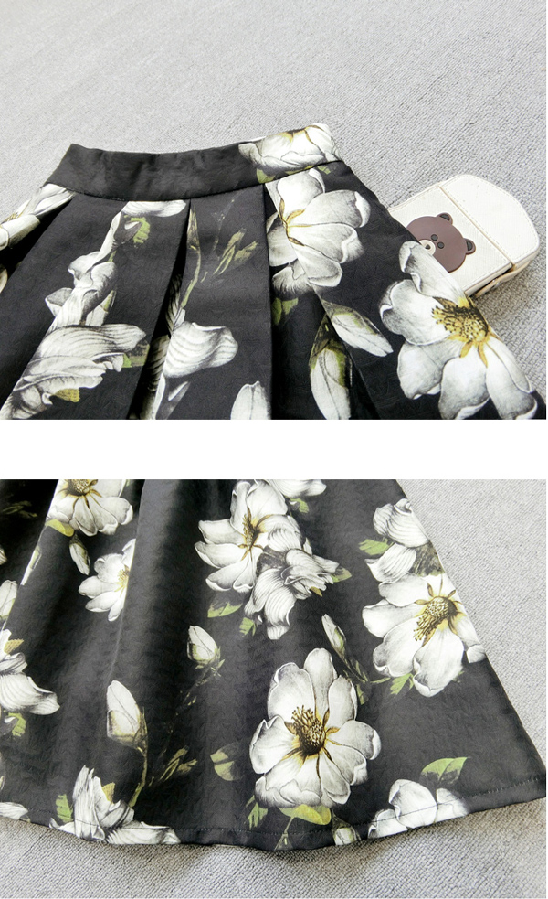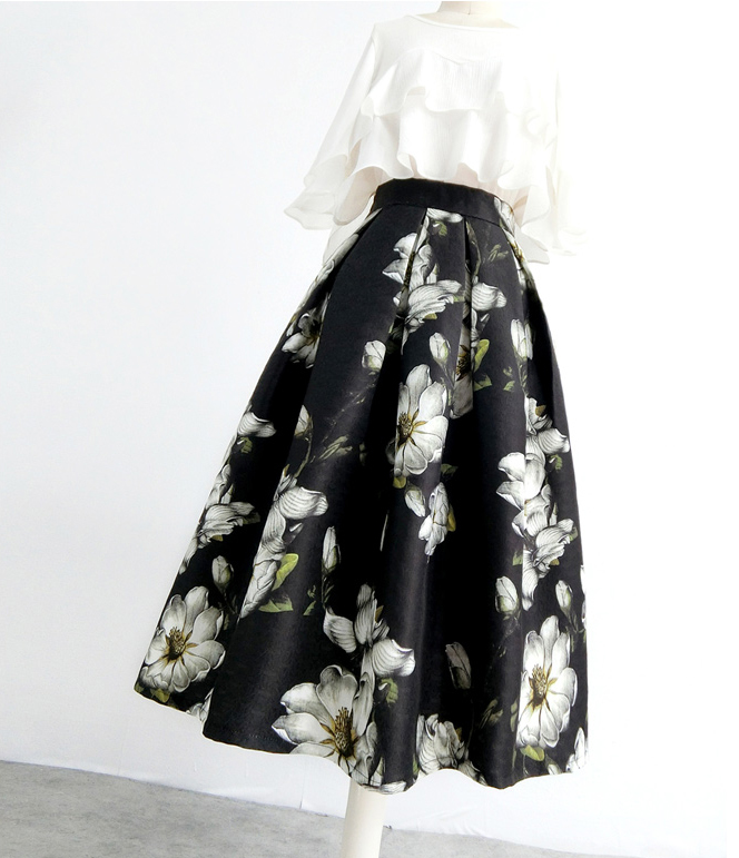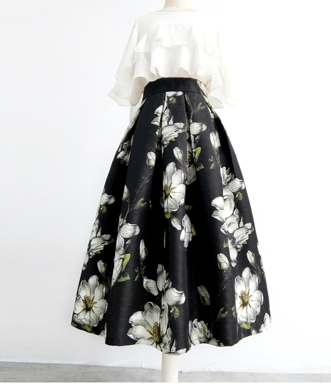 2022 Womens Black Floral Skirt, Mdi Black Floral Skirt Outfit, Black Party Skirt Custom Plus Size Pleated Midi Formal Skirt