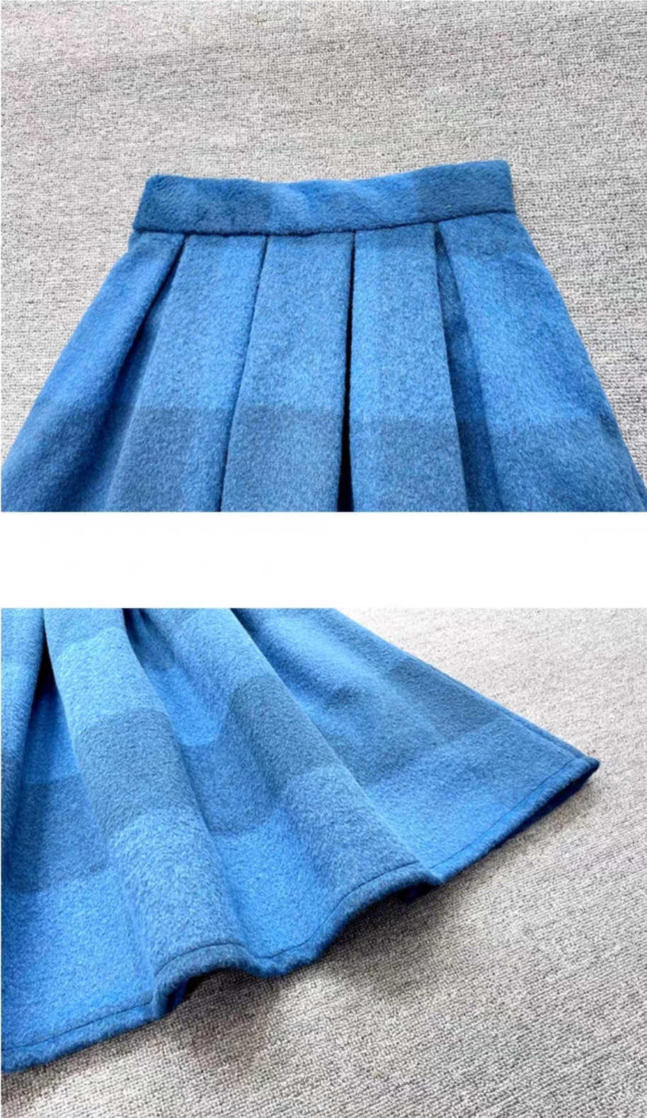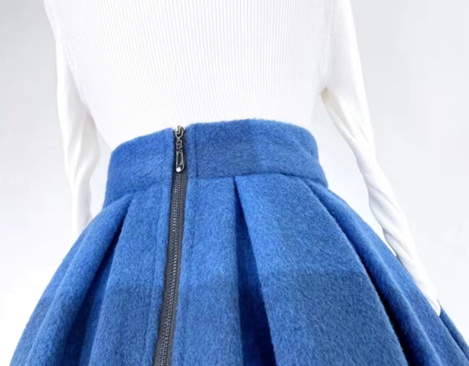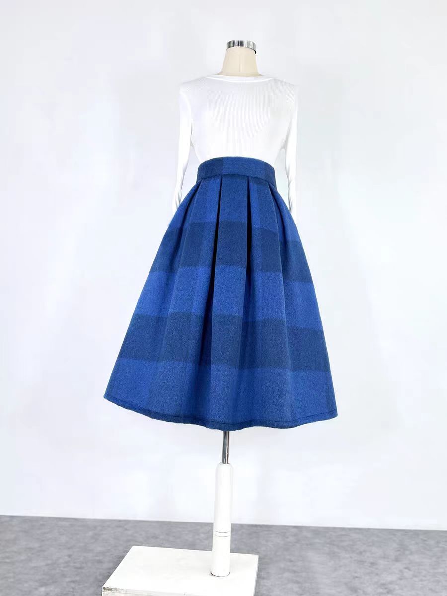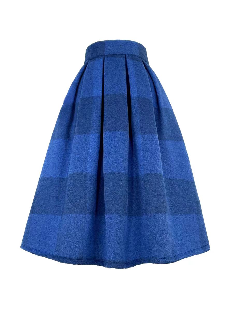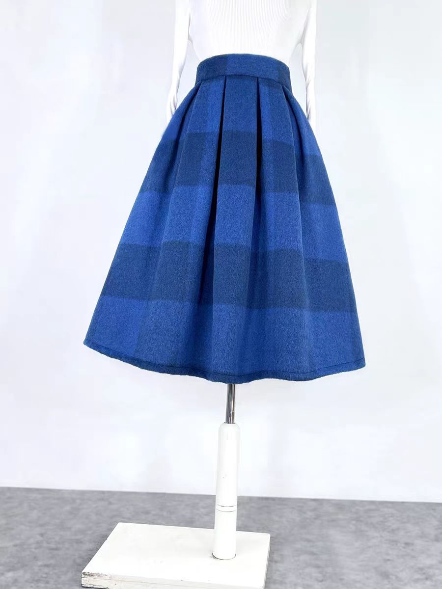 Women Royal Blue Midi Pleated Plaid Skirt Vintage Inspired Warm Winter Holiday Skirt Outfit Wool-blend Party Skirt