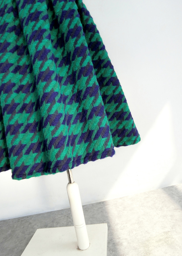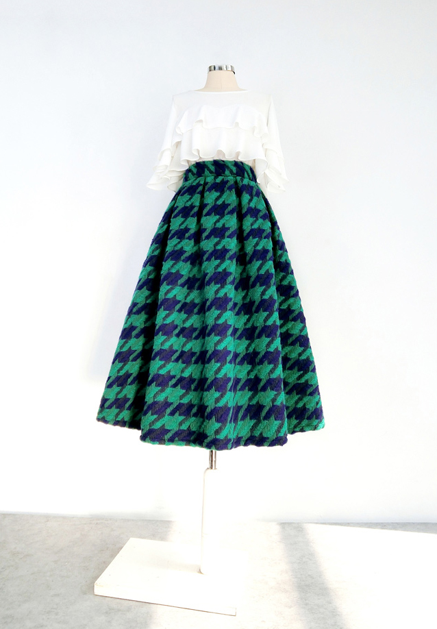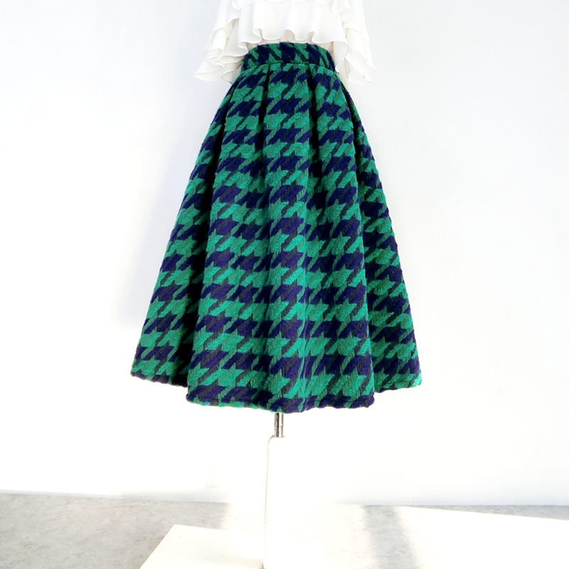 Women Winter Green Houndstooth Midi Holiday Skirt Outfit Woolen Pleated Party Skirt Plus Size