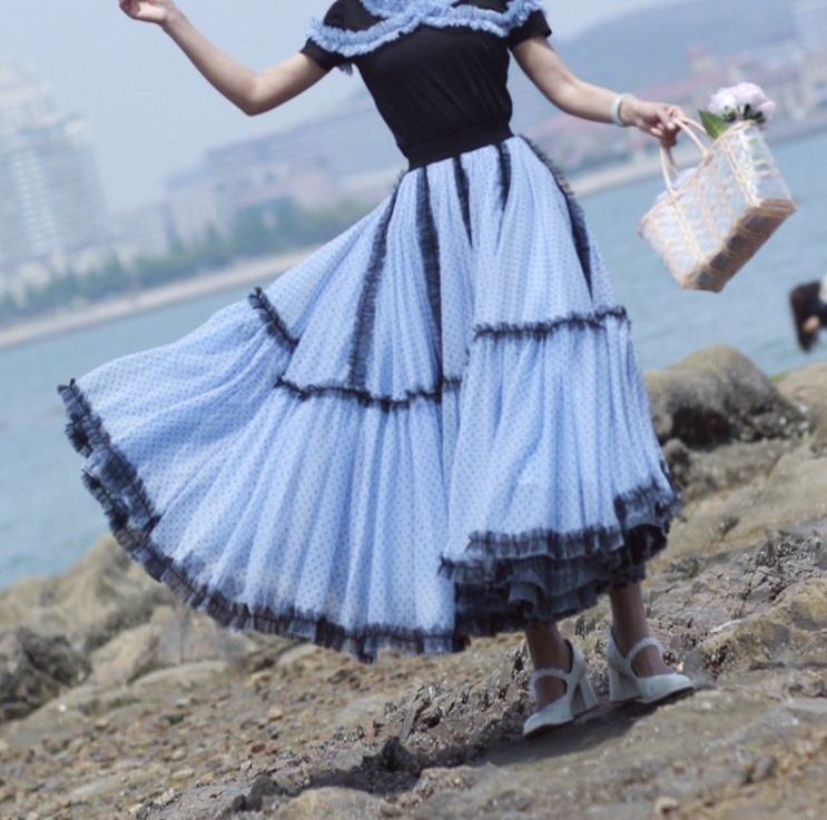 Dusty Blue Polka Dot Long Tulle Skirt Vintage Inspired Holiday Party Skirt Outfit Custom Custom Plus Size